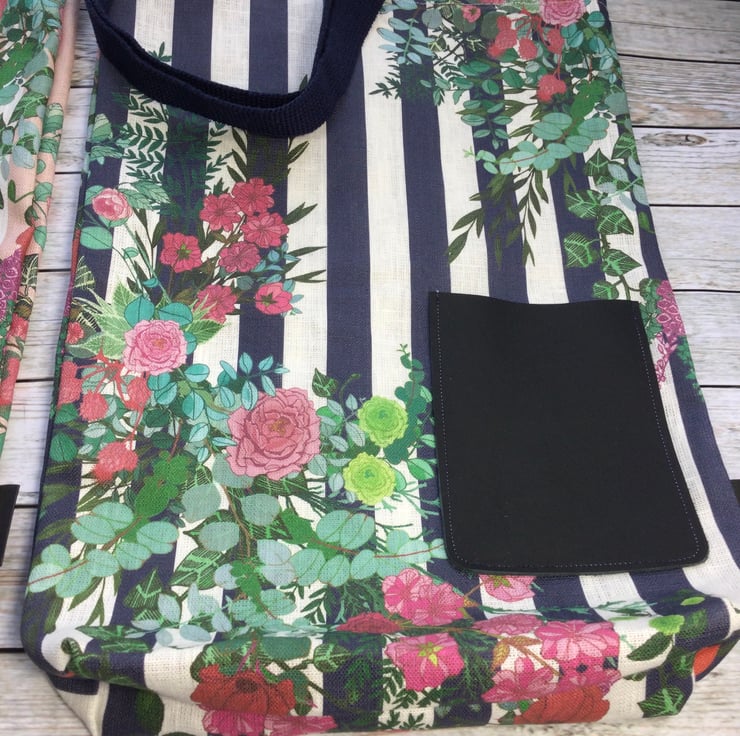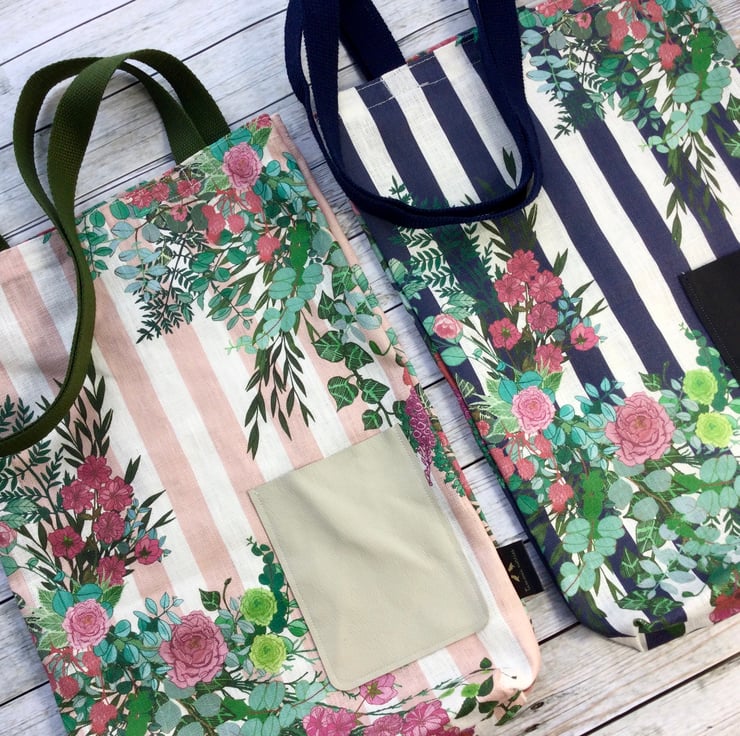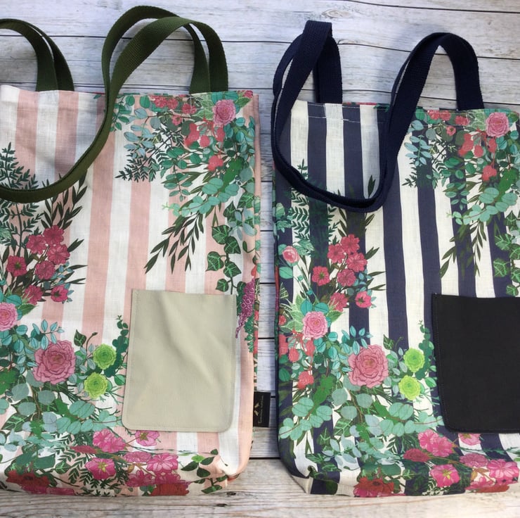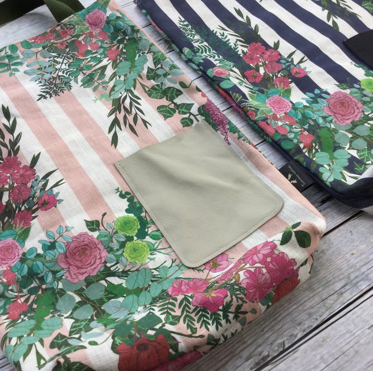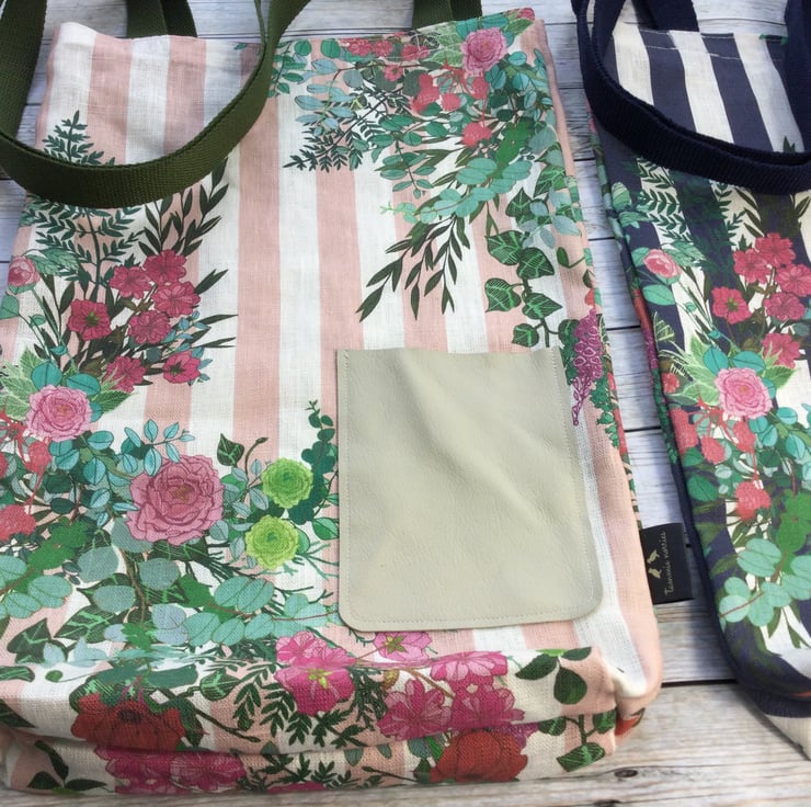 These organic linen tote bags are made available in a pale pink or navy stripe. They have a handy leather pocket on the front made using soft Scottish leather off cuts.