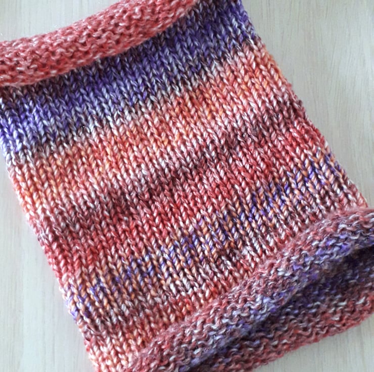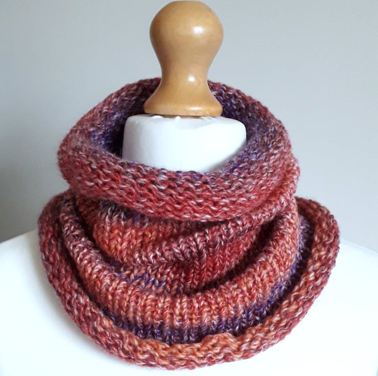 This beautiful cowl has been knitted from soft, chunky acrylic yarn in shades of orange and purple.