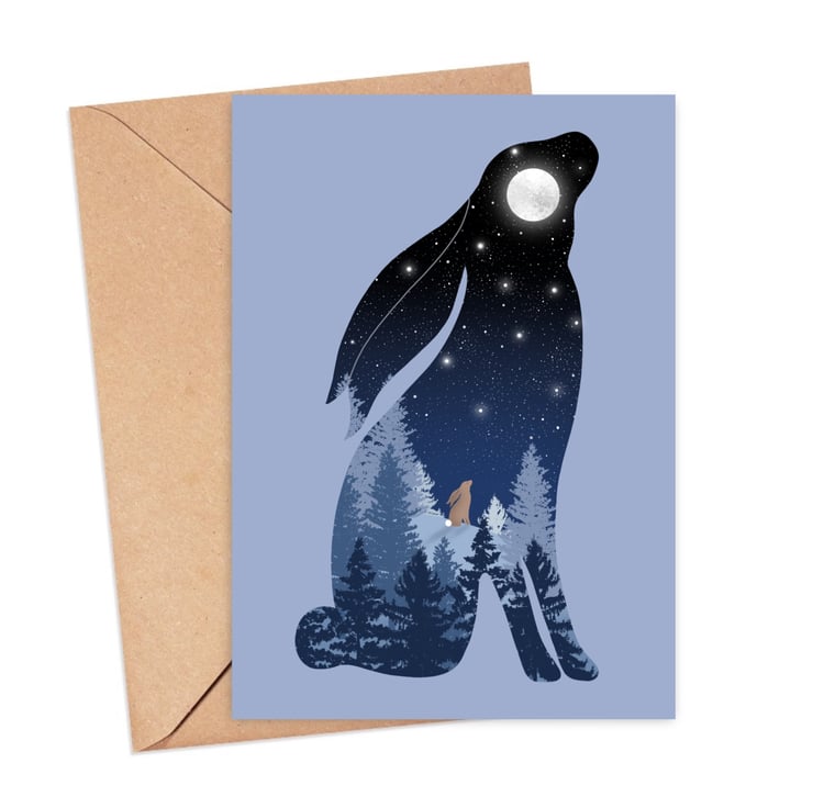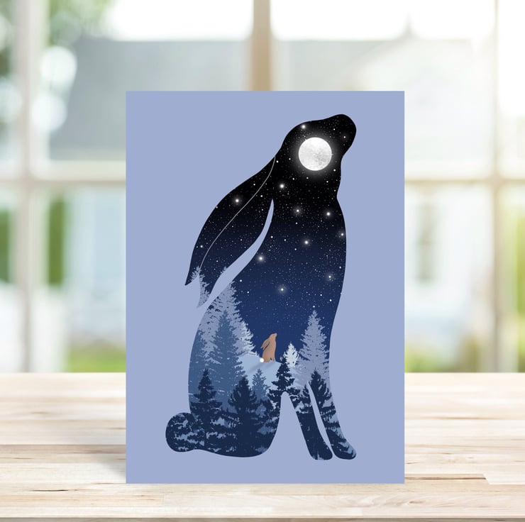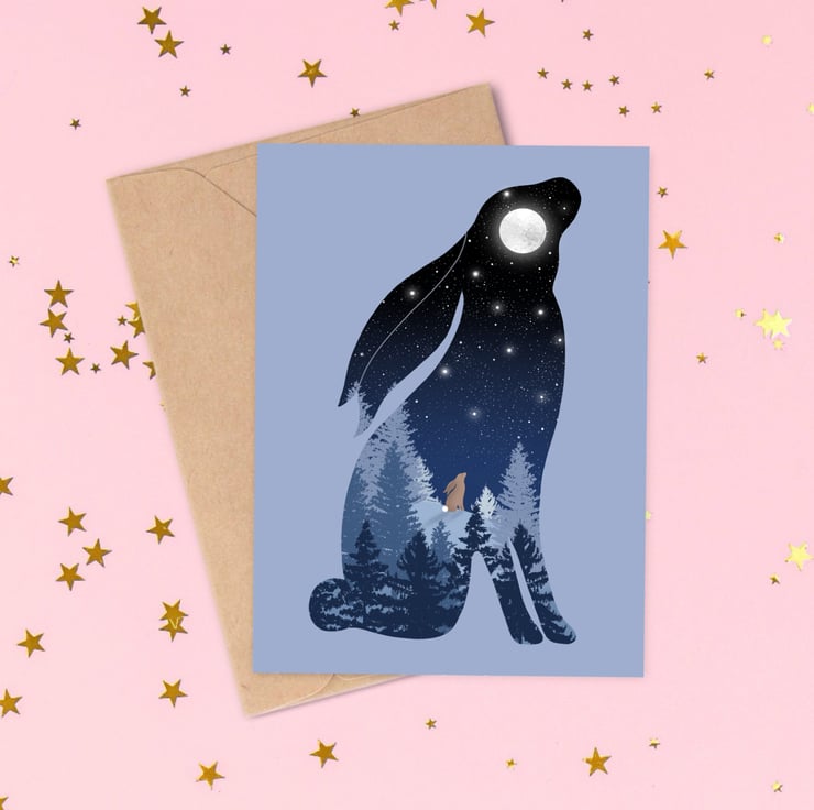 A magical Moon Gazing Hare greeting card. I’ve left him blank on the front and inside so that he can be used for any occasion whether that be birthdays, anniversary’s, or even just to send a nice note to a friend.