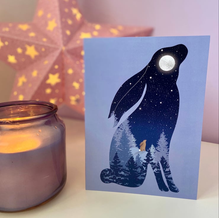 A magical Moon Gazing Hare greeting card. I’ve left him blank on the front and inside so that he can be used for any occasion whether that be birthdays, anniversary’s, or even just to send a nice note to a friend.