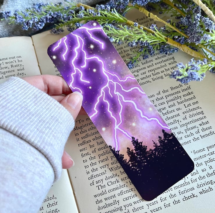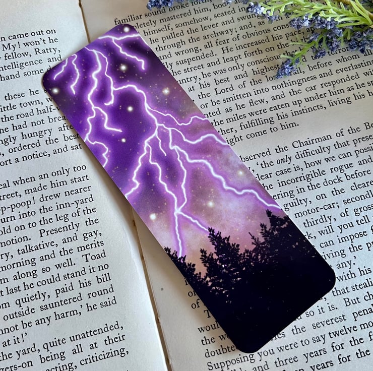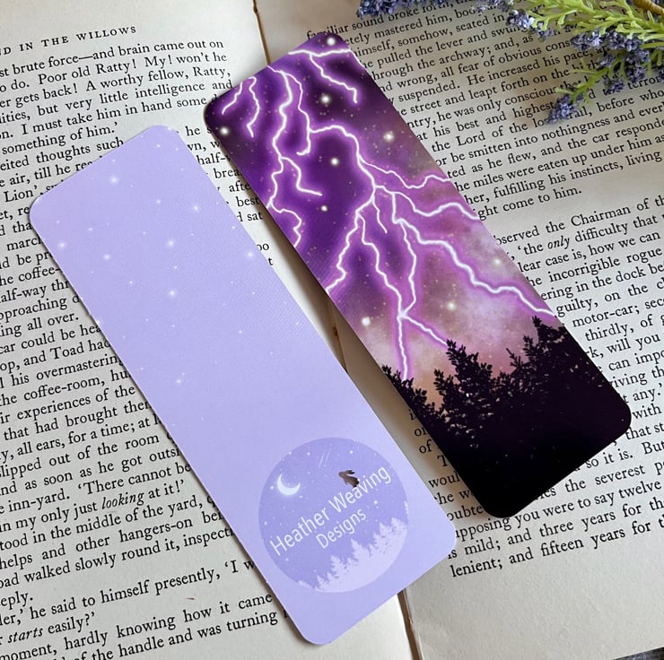 This purple storm forest bookmark has been hand drawn on the iPad and then printed onto 400gsm glossy card stock. Printed on both sides. The lightning drawing is on one side and then my logo and stars are on the back. This bookmark measures 5.1cmx15.2cm