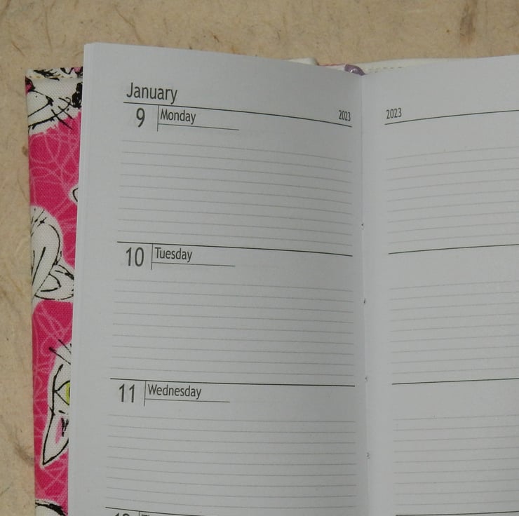 This slim-line style 2023 diary is one for the cat lovers, a fabric covered week to view diary (approx. 6.5 x 3.5 inches). It is covered in a cute, quirky cat print fabric. Complete with 2023 diary, refills are easily available, for the next year. The cover is lined, interfaced and removable.