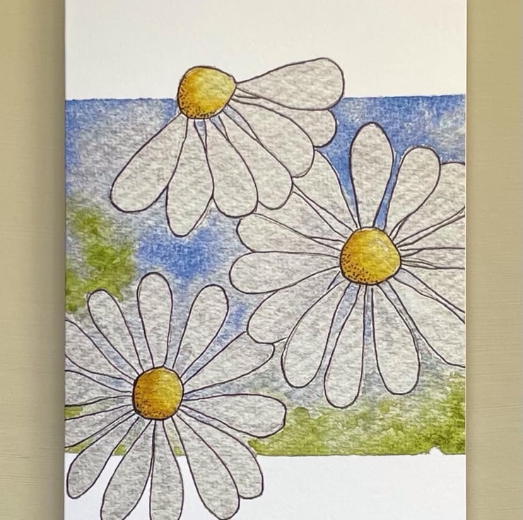 White daisy type flowers with a blue and green background watercolour wash, with the top and bottom of the card left un painted.