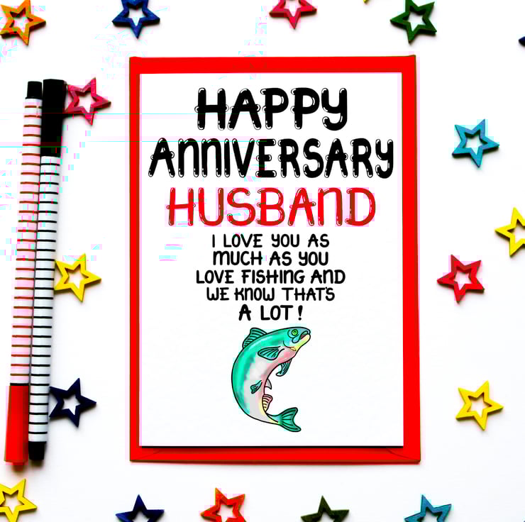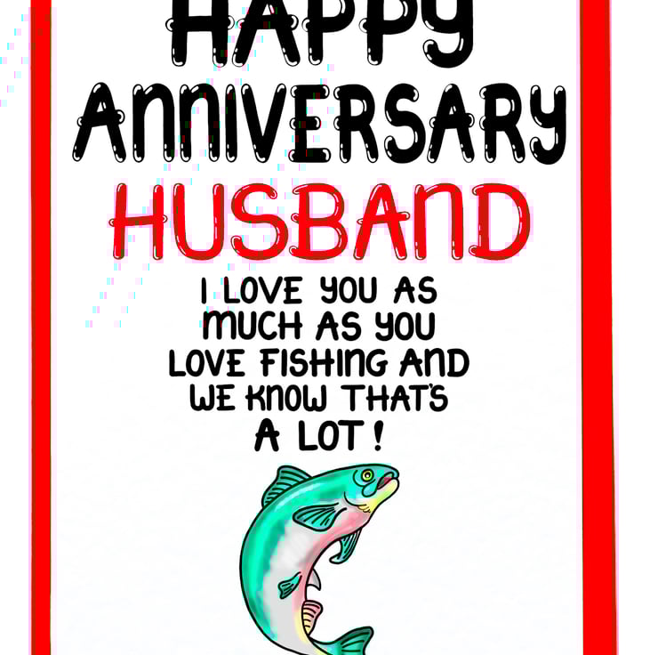 Greeting on front: HAPPY ANNIVERSARY (NAME) I LOVE YOU AS MUCH AS YOU LOVE FISHING AND WE KNOW THAT'S A LOT!