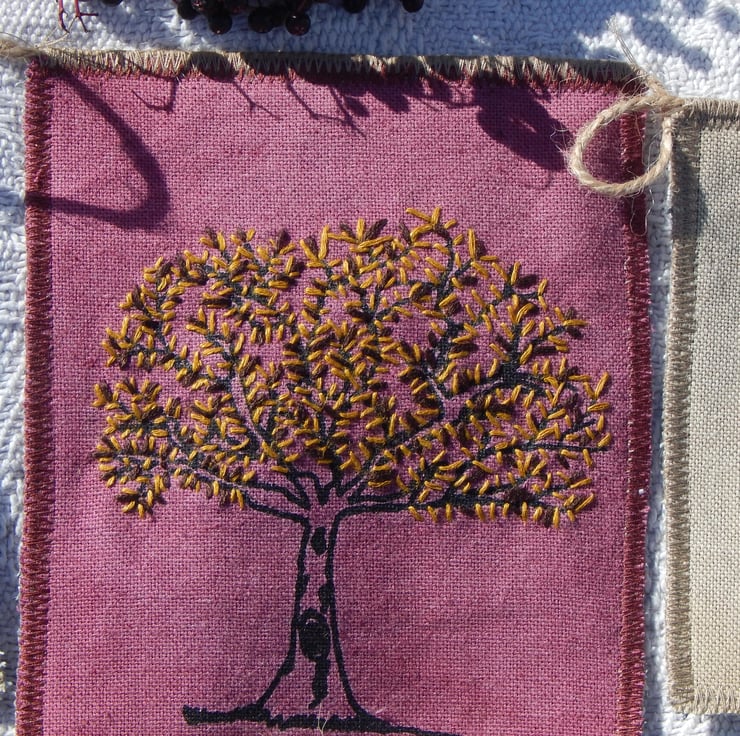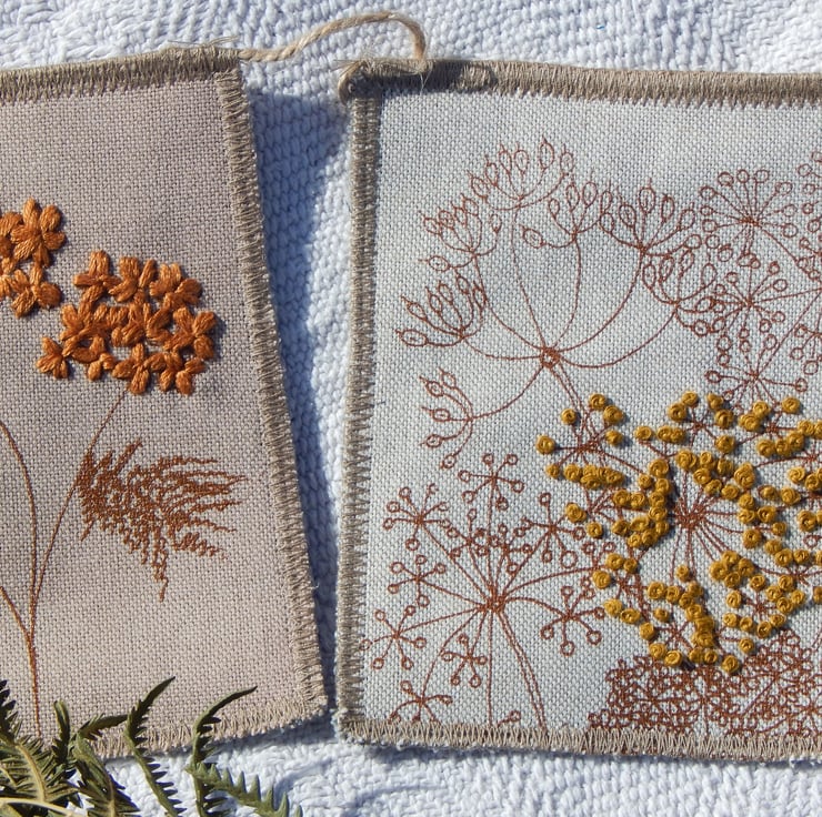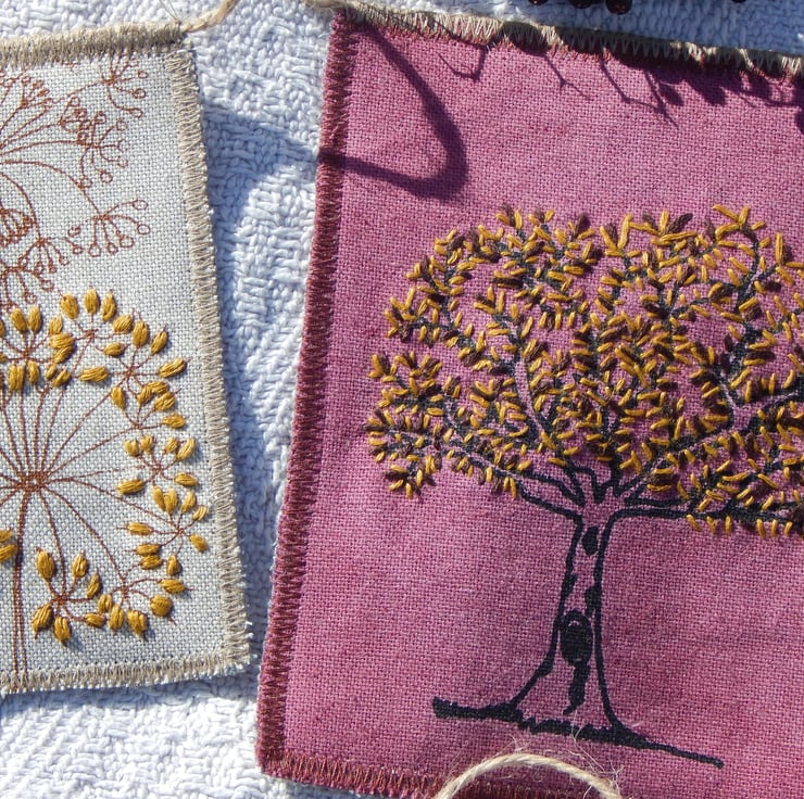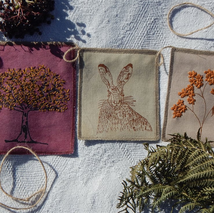 There are 5 panels that have my screen print designs printed onto them. There is a hare that measures approximately 11cm by 13 cm and he has been screen printed in brown onto a naturally dyed, with bracken, piece of cotton. There is a elderberry dyed piece with a oak tree screen printed onto it with hand embroidered autumn leaves, this measures approximately 13cm by 16cm. There are 2 pieces with cow parsley screen printed on to them with one seed head on each hand embroidered. There is one piece with a yarrow seedhead screen printed with hand embroidered seeds.