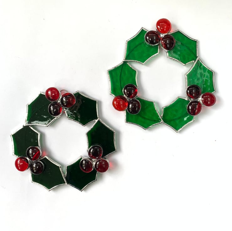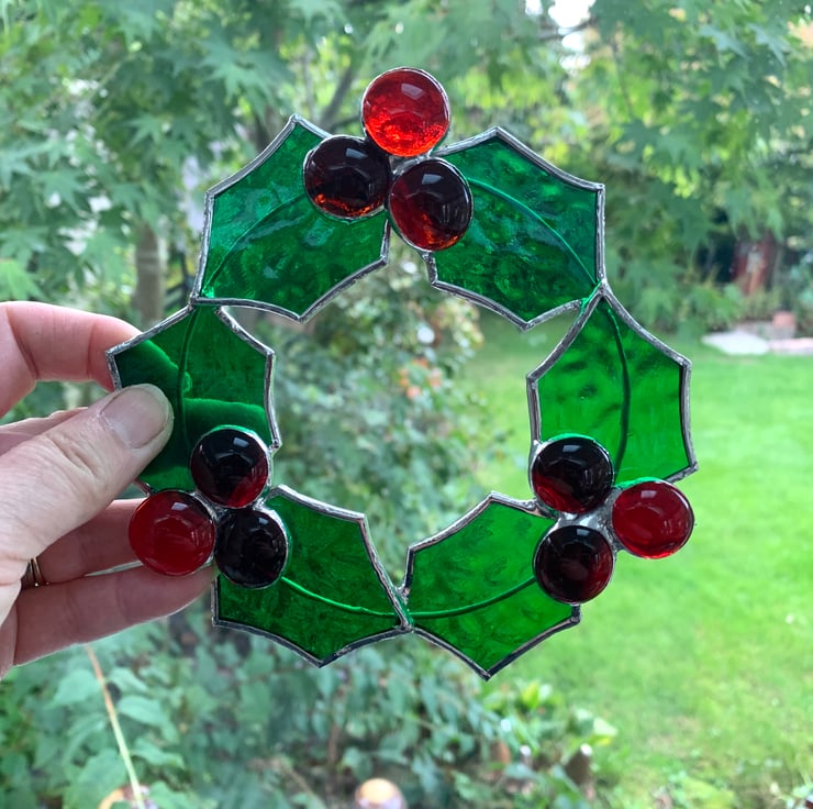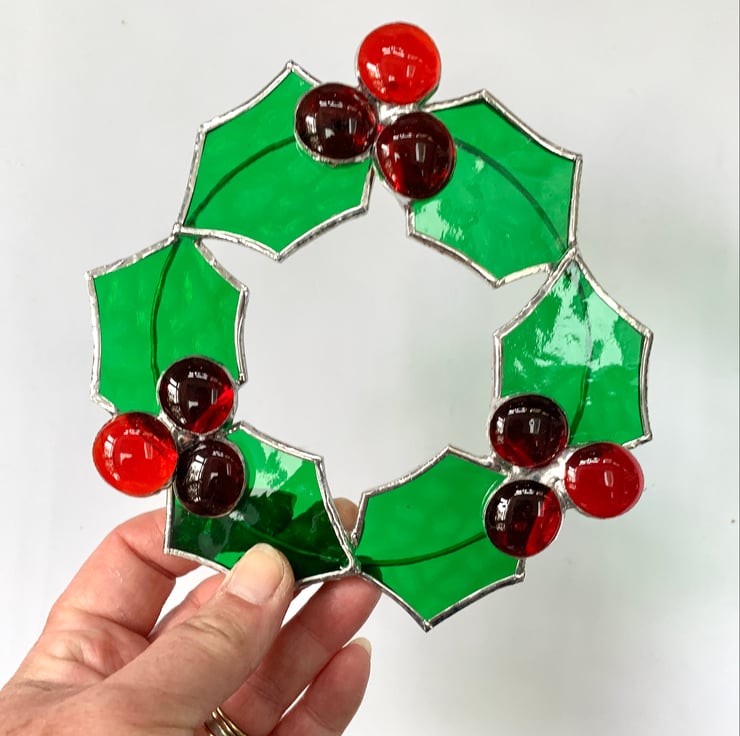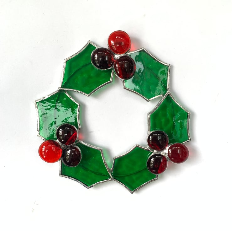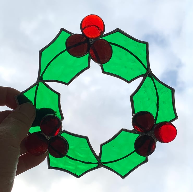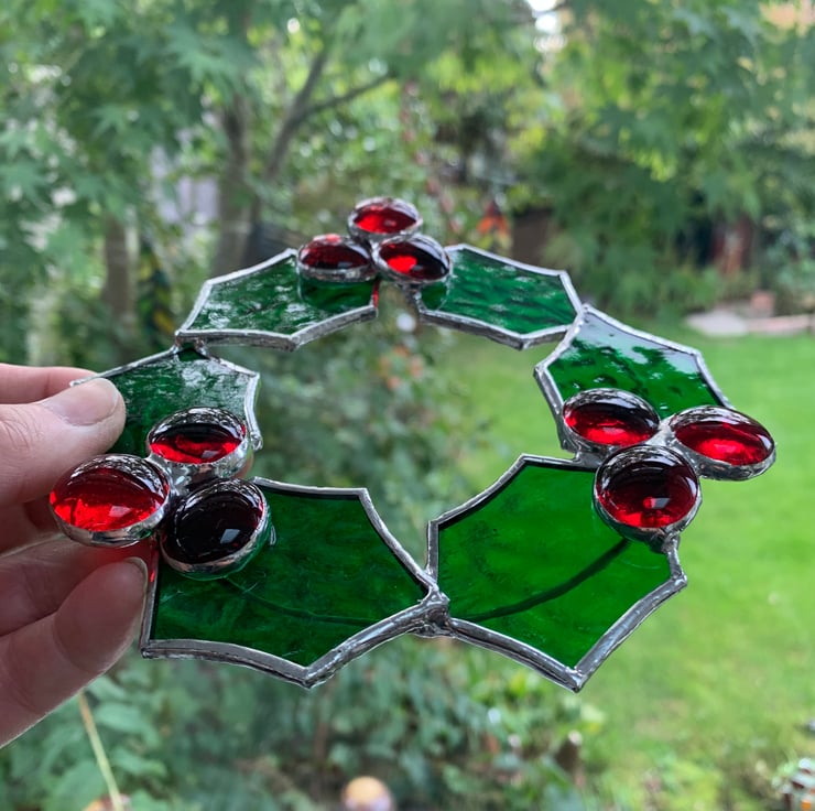 Each piece of glass has been cut by hand, ground, washed and foiled. The 6 leaves have been soldered to a tinned copper wire ring, 9 red glass nuggets have been used for the holly berries.