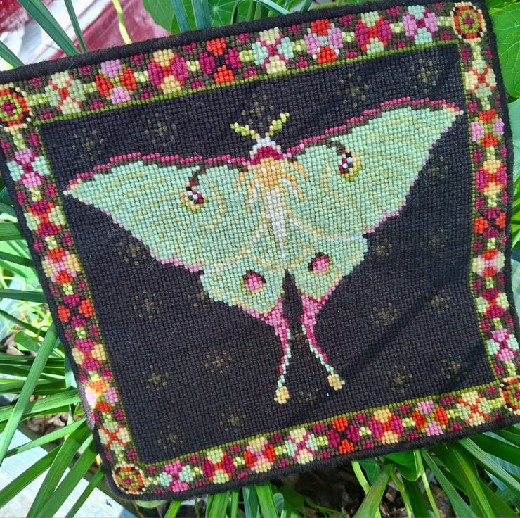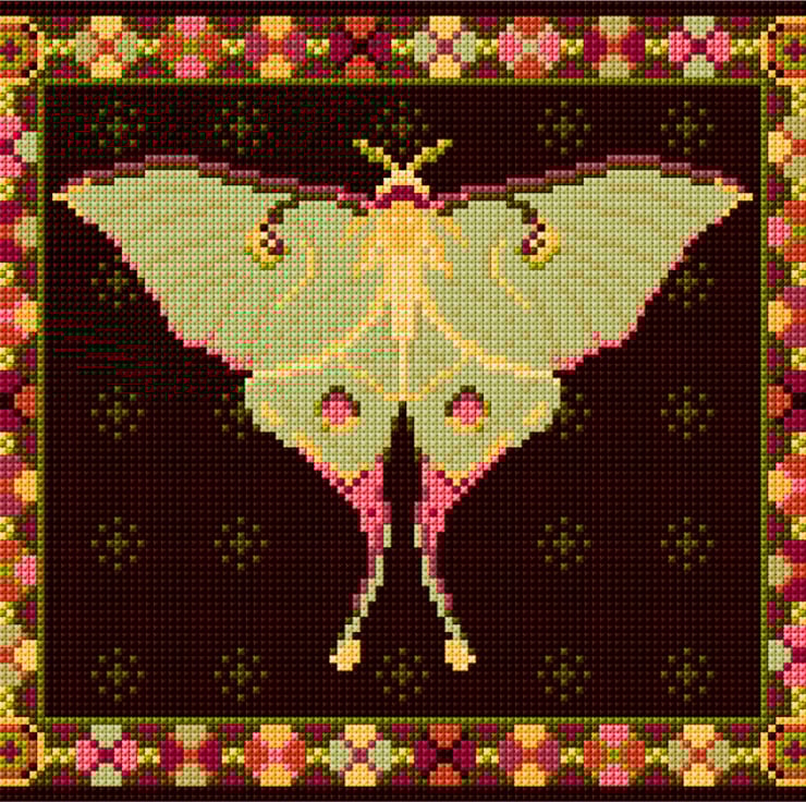 Luna Moth Tapestry Kit, a fabulous and elegant needlework design in gorgeous rich wool colours.