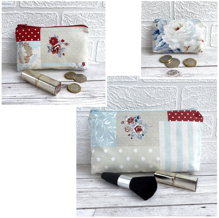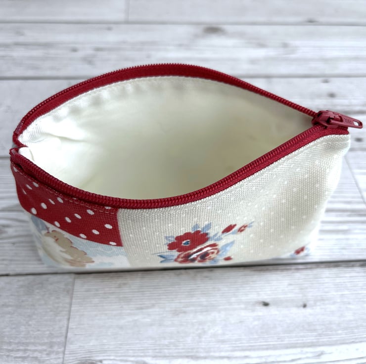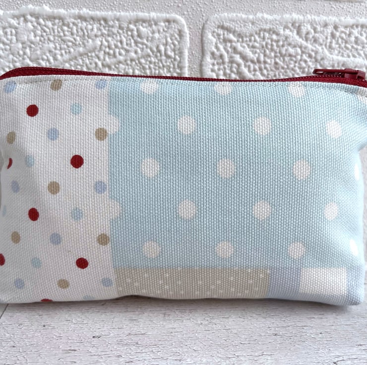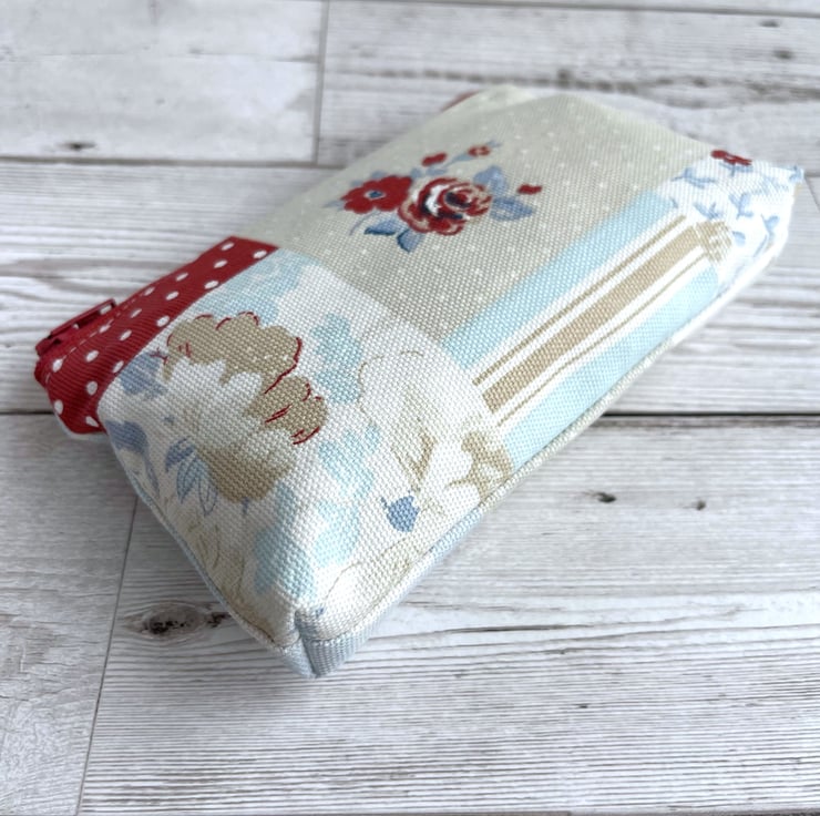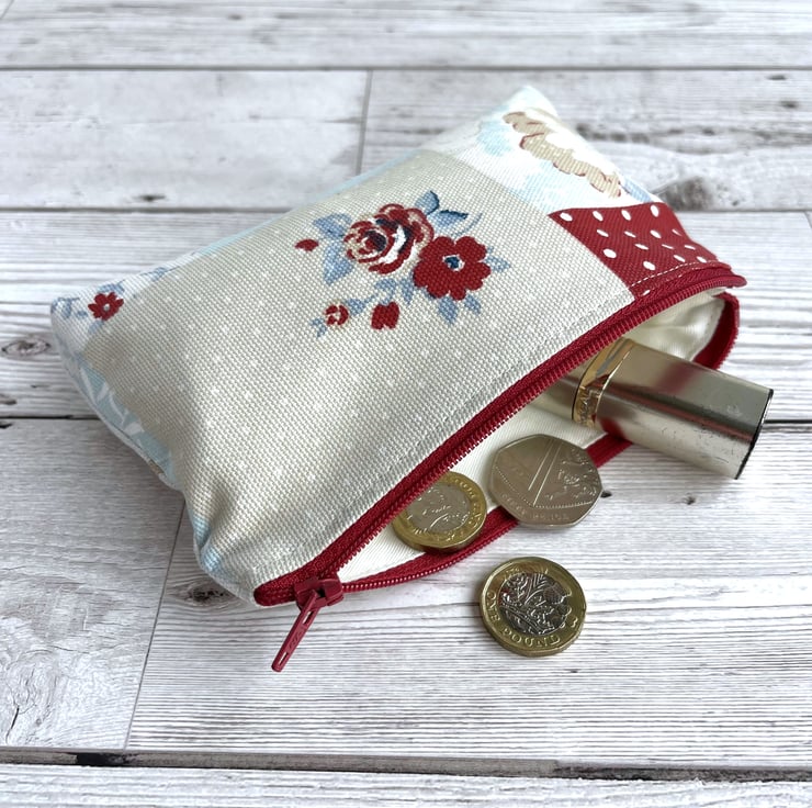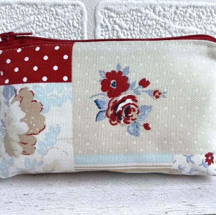 Large coin purse in patchwork print fabric. This large-sized purse is made from pretty print fabric with a patchwork pattern. The pattern consists of floral, leafy, polka dot, stripe and check patterned sections. The colour palette is mainly pastel, in shades of beige, white, and pale blue, with splashes of darker blue and deep red. The coin purse fastens with a matching deep red zip and is lined with cream fabric. The base of the purse is boxed to give more space inside.