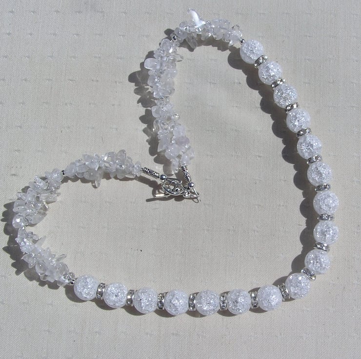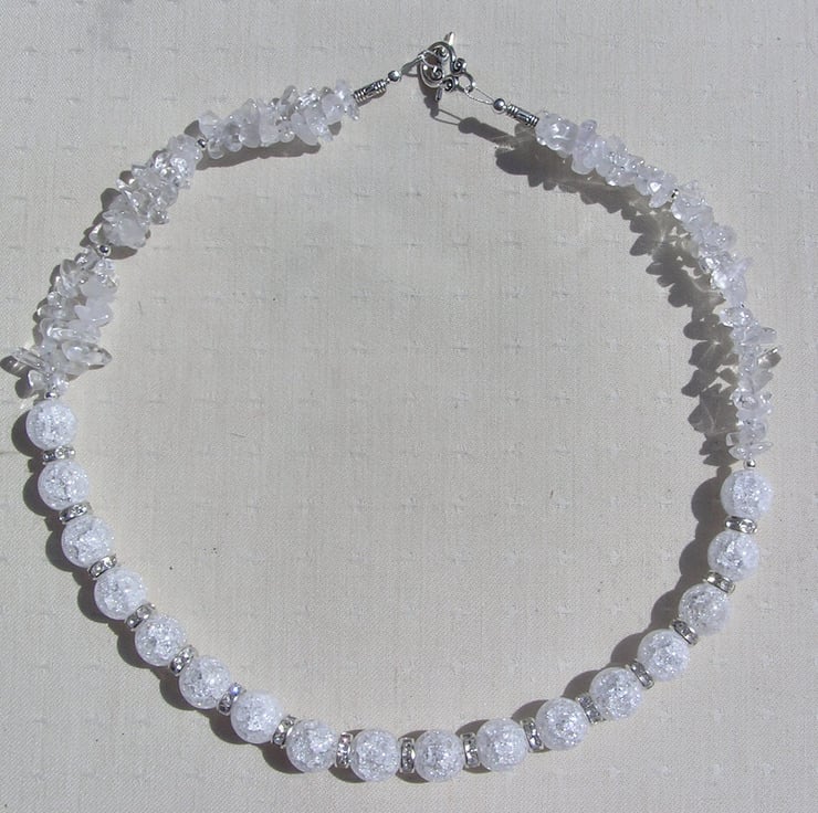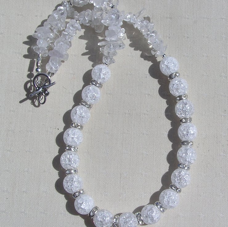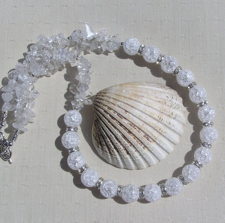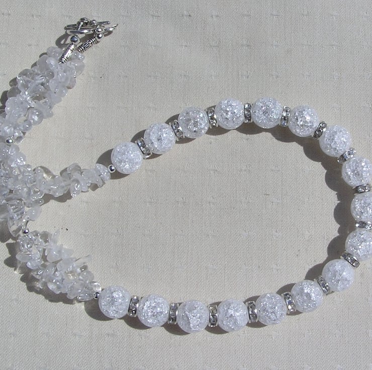 This Stunning Necklace is made wholly from Clear Quartz (Rock Crystal) - Chunky Crackled Quartz Round Beads alternated with Glistening Crystal studded spacers which then flow into double-stranded Clear Quartz Gem chips - a cool fresh mix that will look stunning either worn casually or with something more Elegant for a Special Evening out