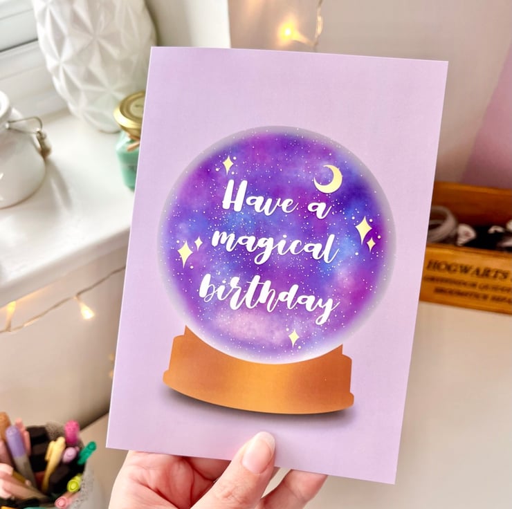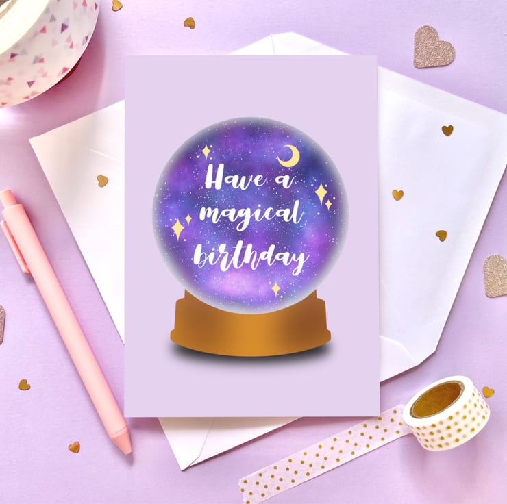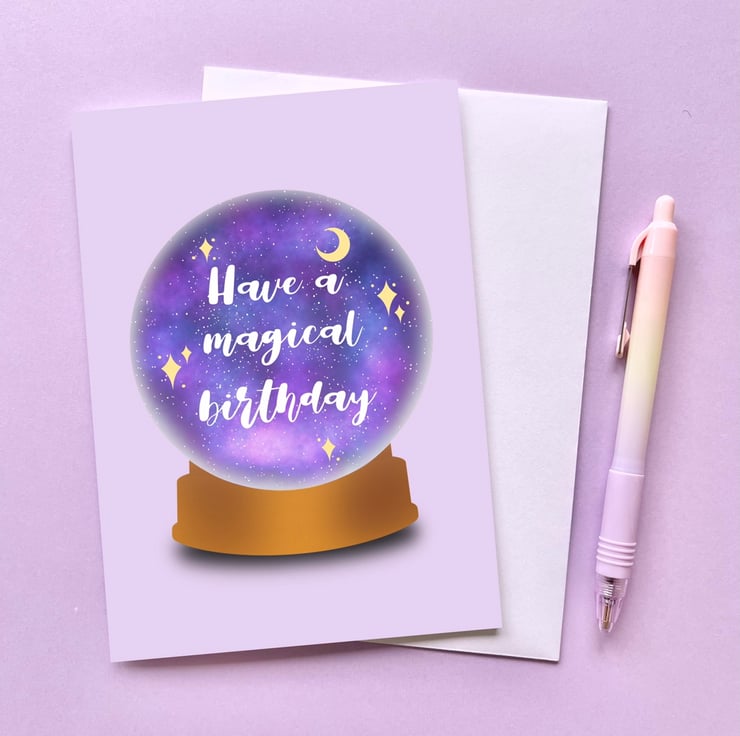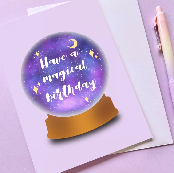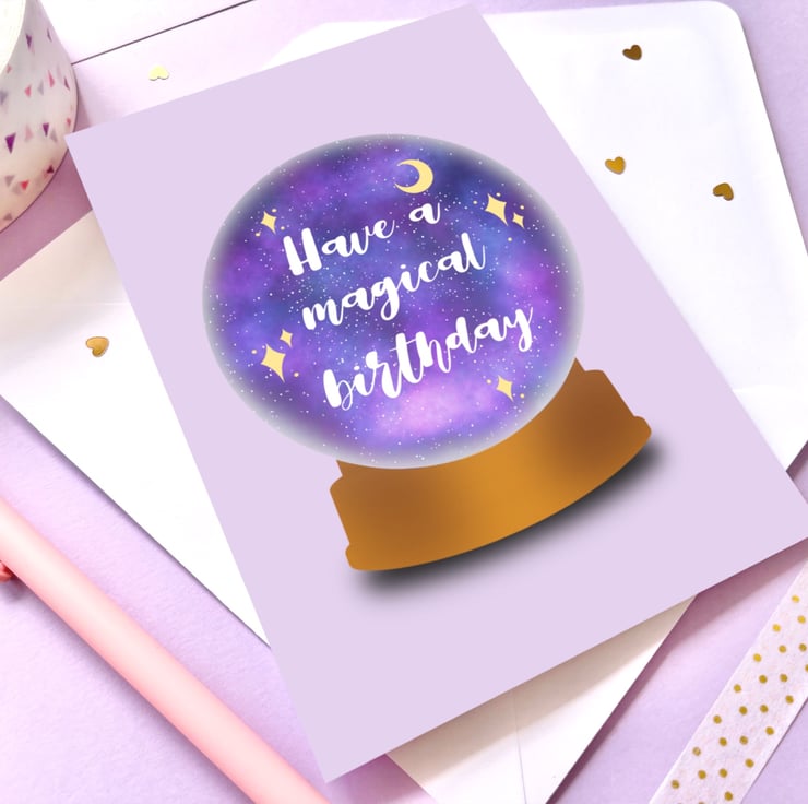 This super magical birthday card design has been hand drawn on the iPad using Procreate and features a crystal ball with a magical background. It has then been printed on to 300gsm card stock and the card also comes with a white envelope. The card is blank inside.