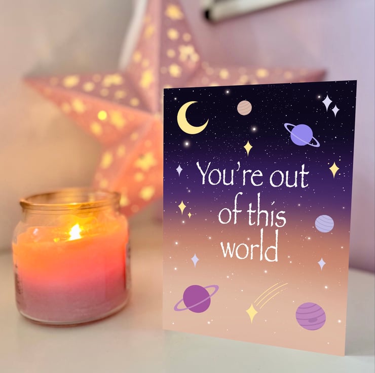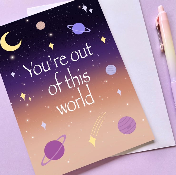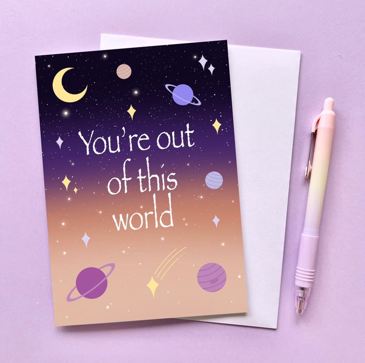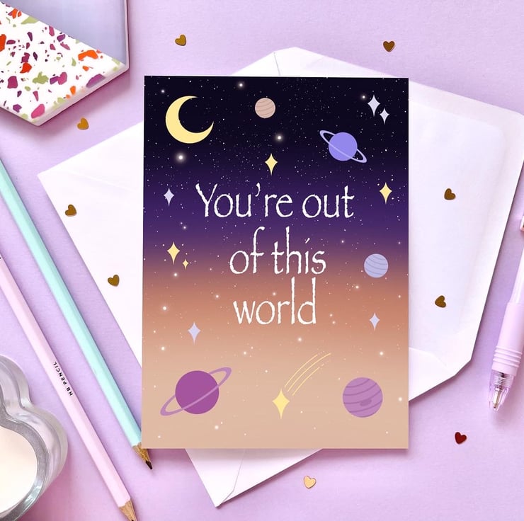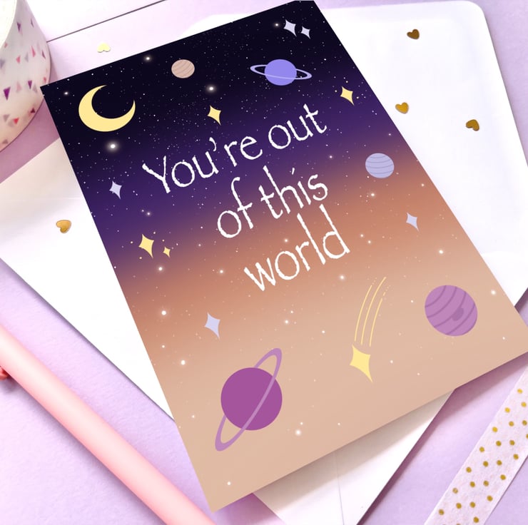 Send this fab themed space card to a loved one or friend and let them know that they are out of this world. The design has been hand drawn on the iPad using Procreate. It has then been printed on to 300gsm card stock and the card also comes with a white envelope. The card is blank inside.