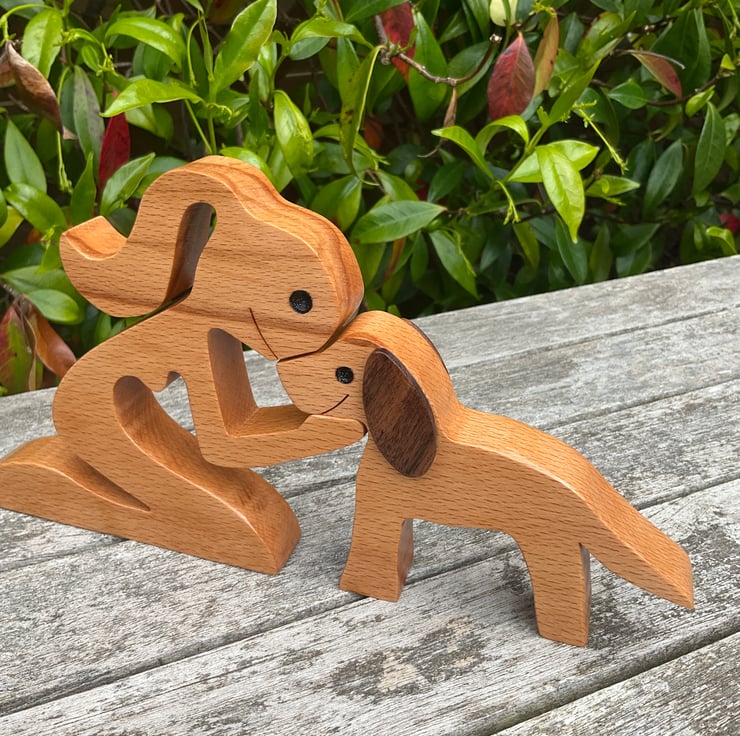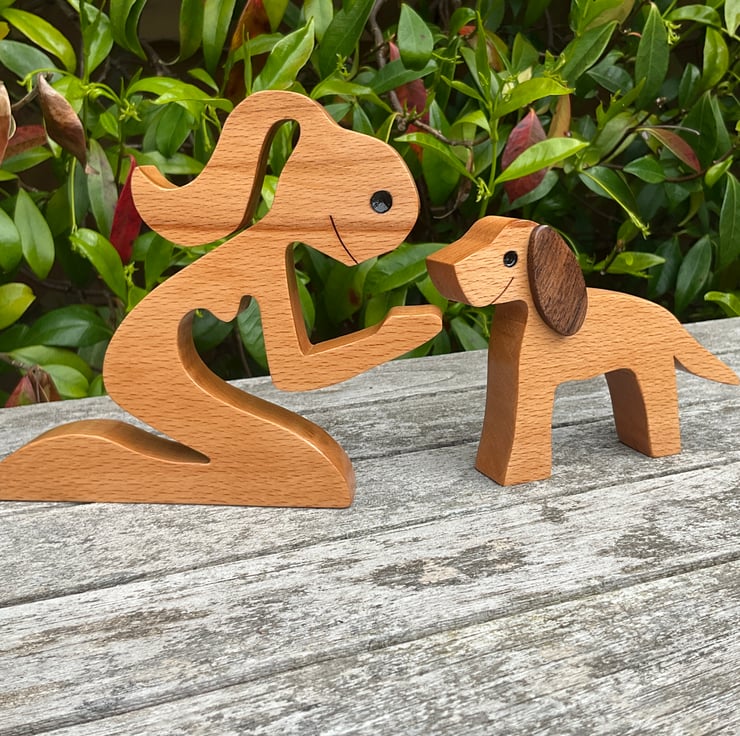 The pieces are made from hard beech wood, the dogs ears from contrasting walnut. Beech wood has the advantages of being very durable, does not splinter and after sanding being very smooth and tactile.