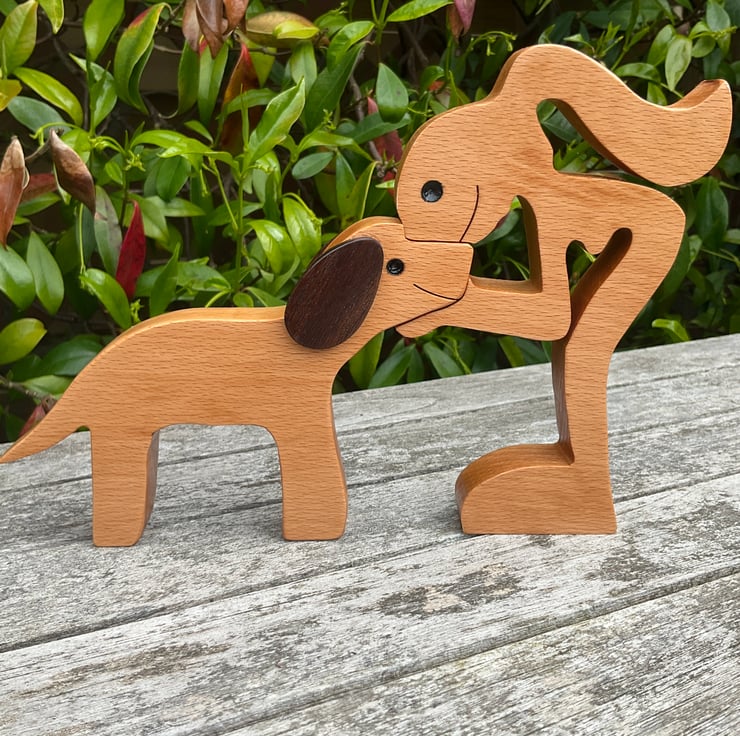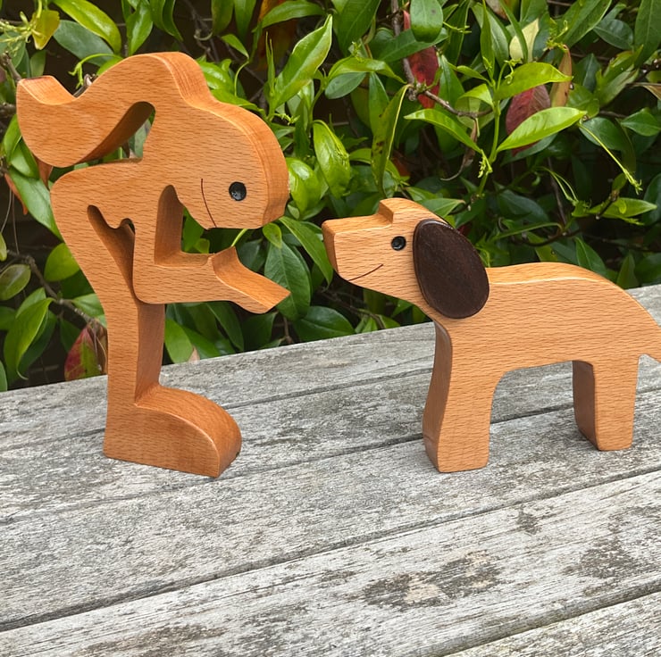 The pieces are made from hard beech wood, the dogs ears from contrasting walnut. Beech wood has the advantages of being very durable, does not splinter and after sanding being very smooth and tactile.