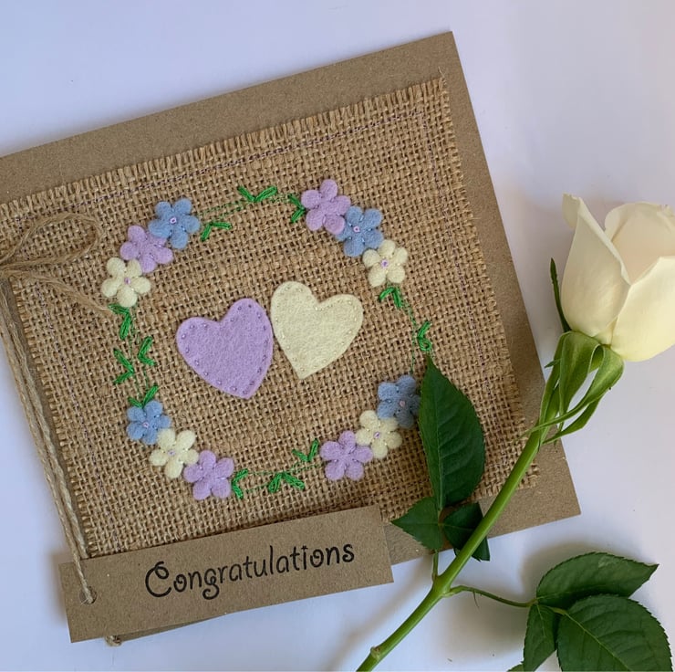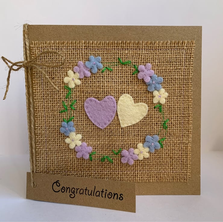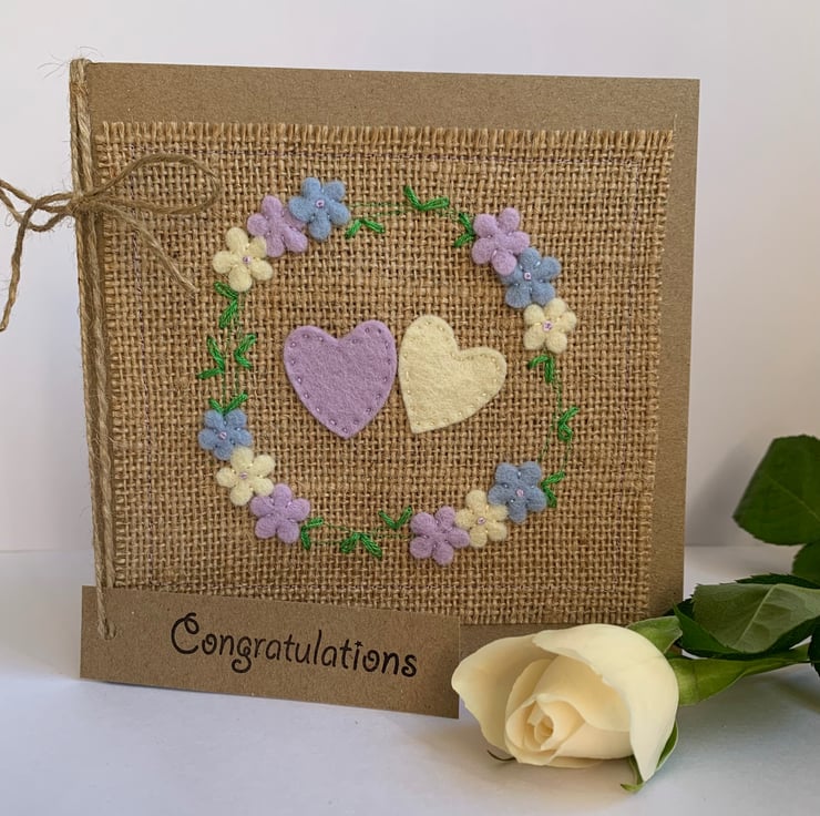 This unique handmade card can send congratulations on an engagement, wedding or anniversary. The card is decorated with hearts in cream and lilac surrounded by a circle of flowers in lilac, pale blue and cream.