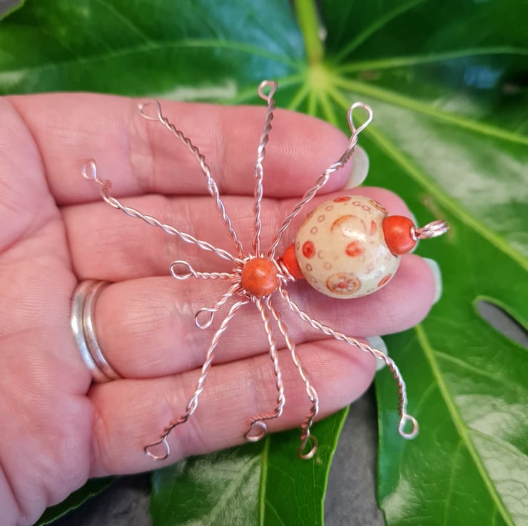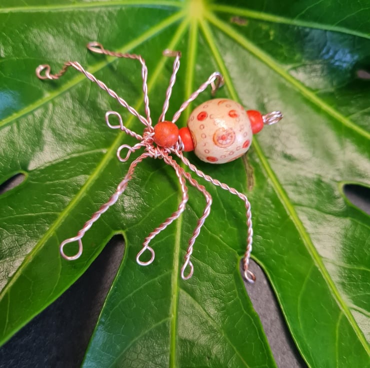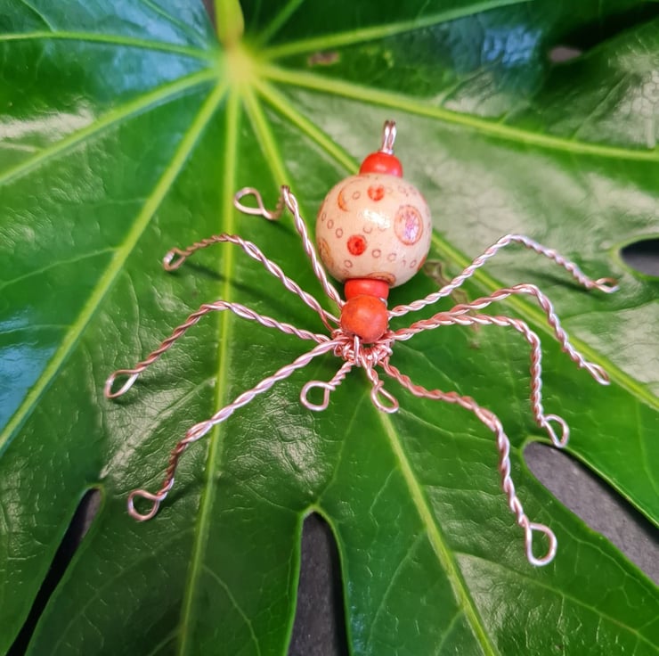 Handmade Spider using wire wrapping techniques combined with a 15mm wooden bead and 3 x turquoise howlite beads.