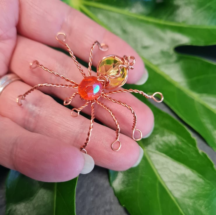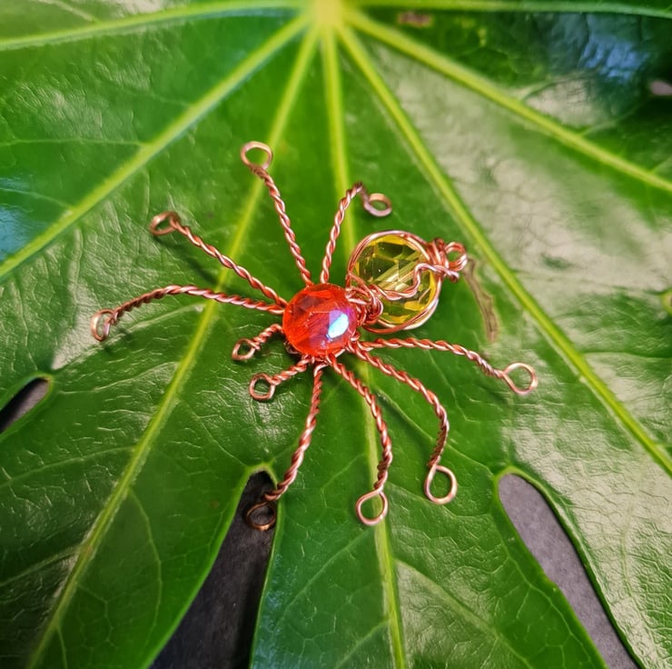 Handmade Spider using wire wrapping techniques combined with a 12x10mm yellow crystal, 8mm orange crystal and copper wire.