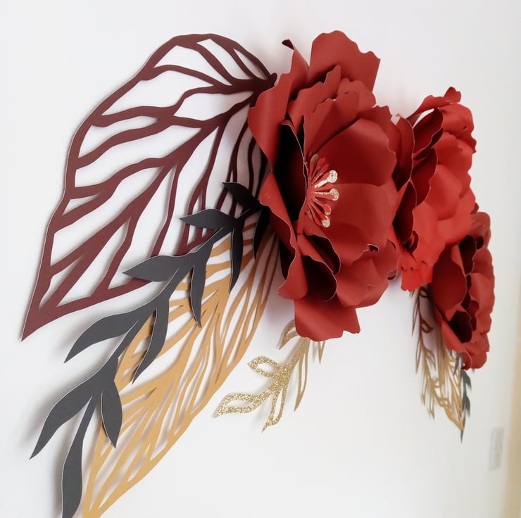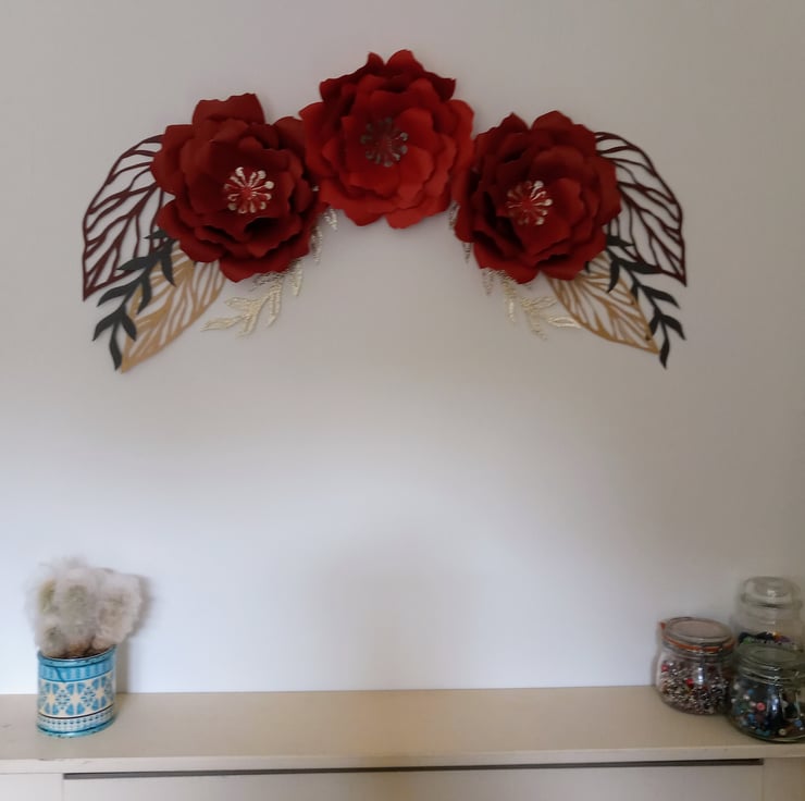 Paper Wall Art/Backdrop, red flowers and foliage all made from cardstock/paper.