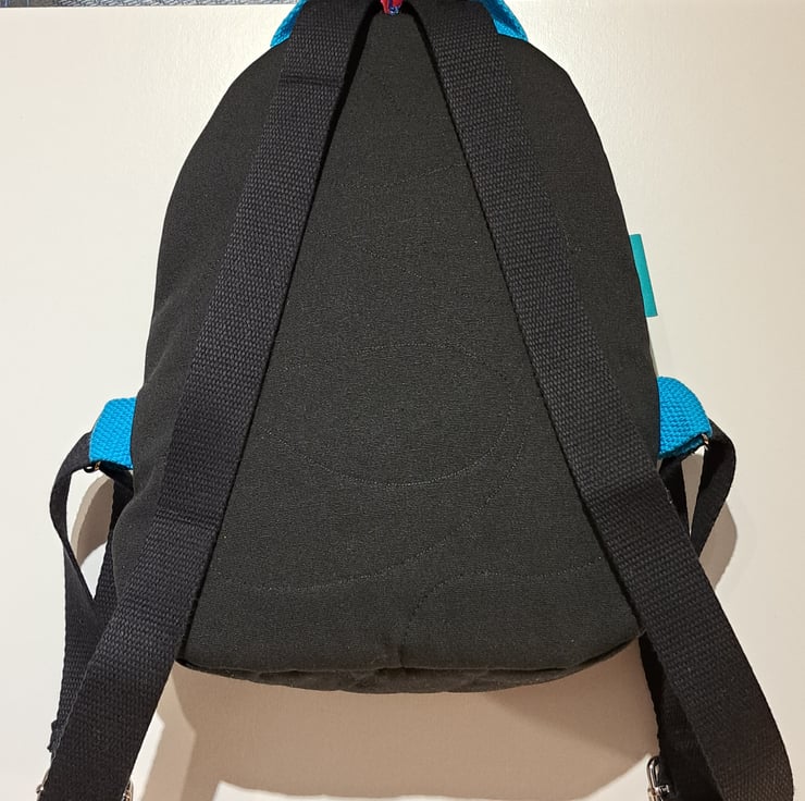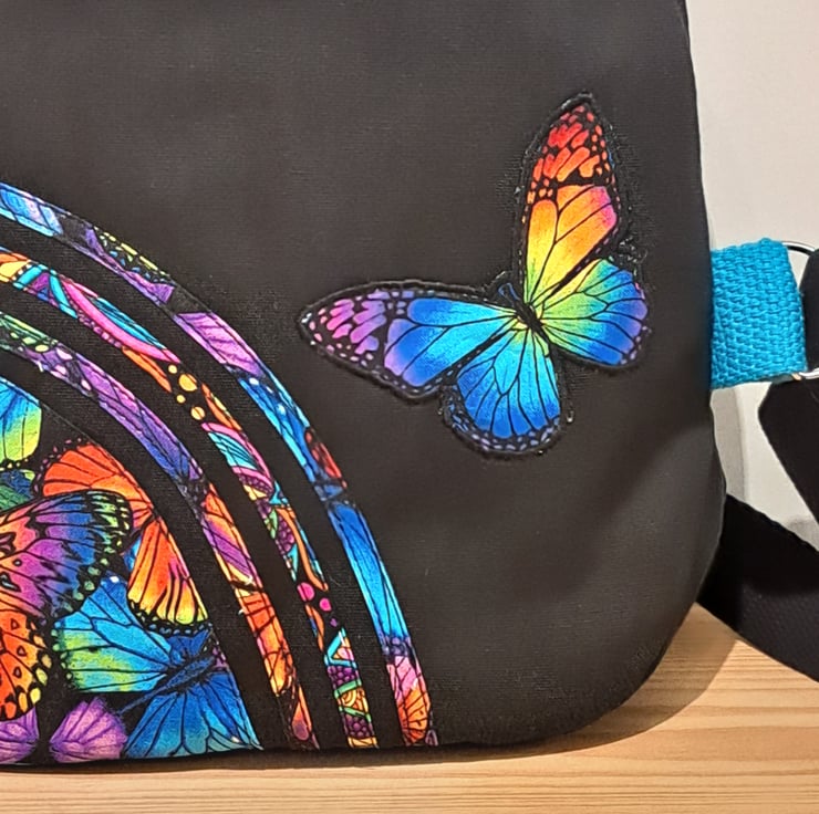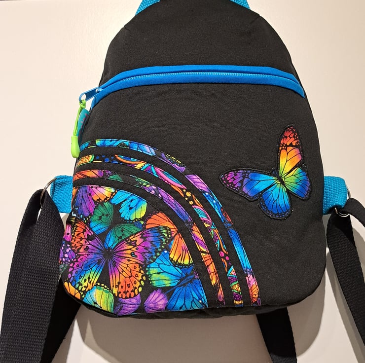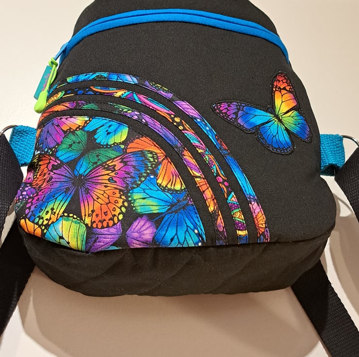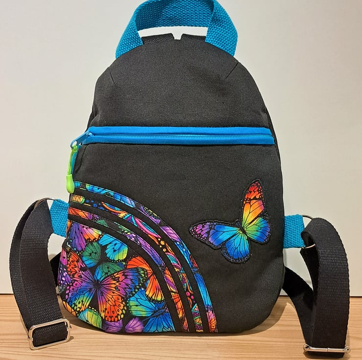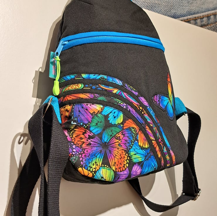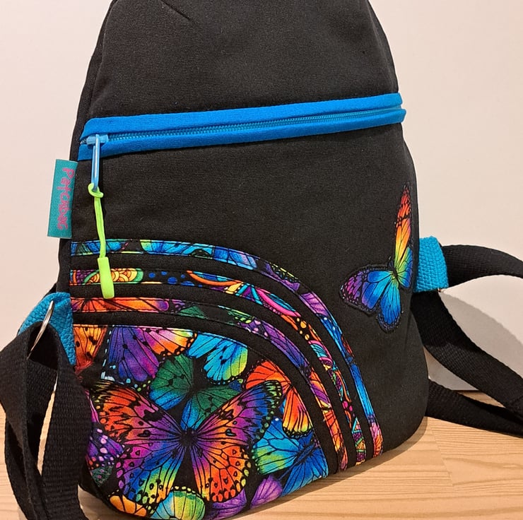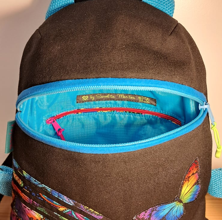 Black lightweight canvas rucksack for ladies with colorful butterfly pattern and butterfly applique.The rucksack closing with zip on the front the shoulder straps are adjustable with metal clasps.The lining made from waterproof fabric, has inner pocket with zip closure. The main fabric is canvas the wonderful butterfly fabric what I used for my rucksack from Timeless Treasures collection.This is a small size rucksack, the dimensions are the following: hight:31cm,width:26cm on the bottom, deept: 8cm on the bottom of the rucksack.