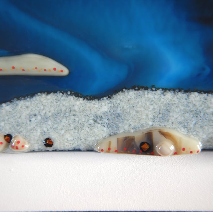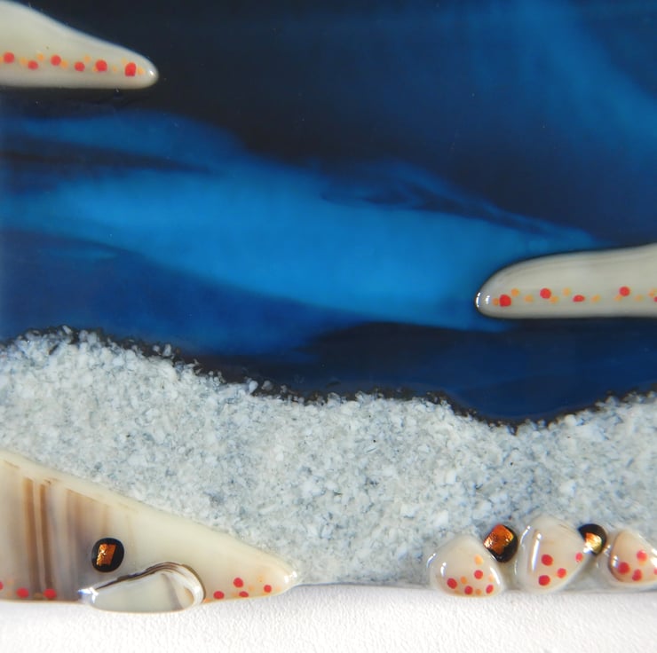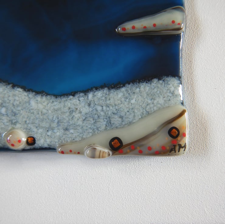 'ISLE OF JURA' is a subtle mix of Scottish colours. The actual isle has been very carefully painted using finely ground powdered glass. The foreground is cut shapes of streaky brown and caramel sheet glass. A tiny bit of bling has been added by scattering little sections of dichroic glass. Once the picture was completed it was then fused in my kiln at 1400 where all sections became one!