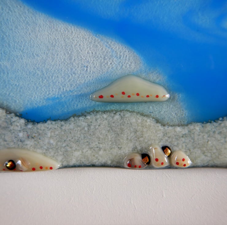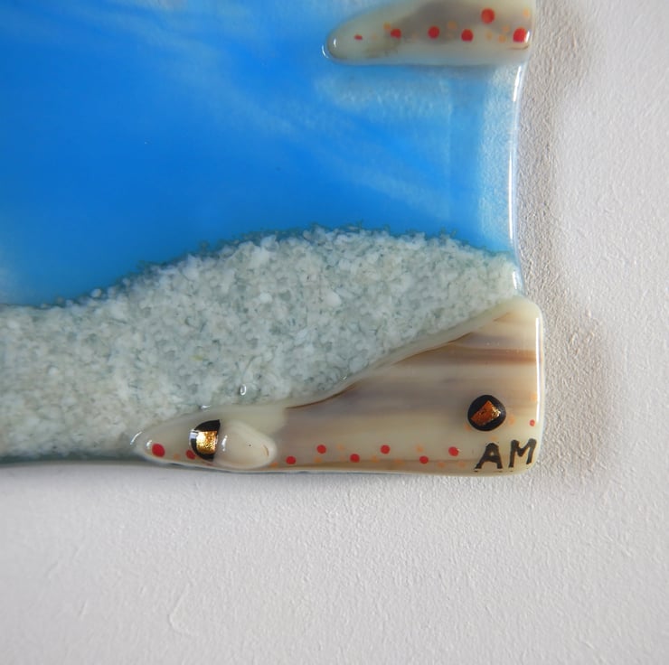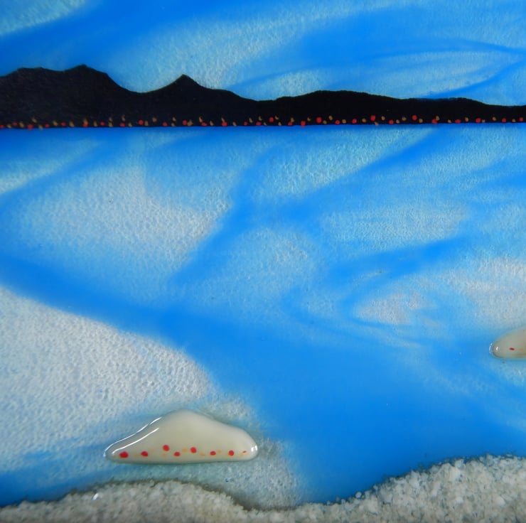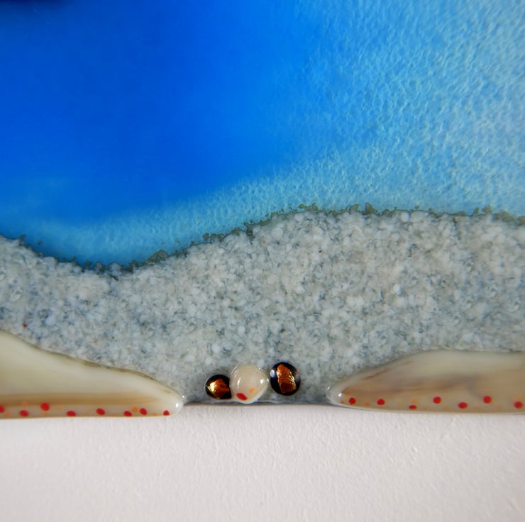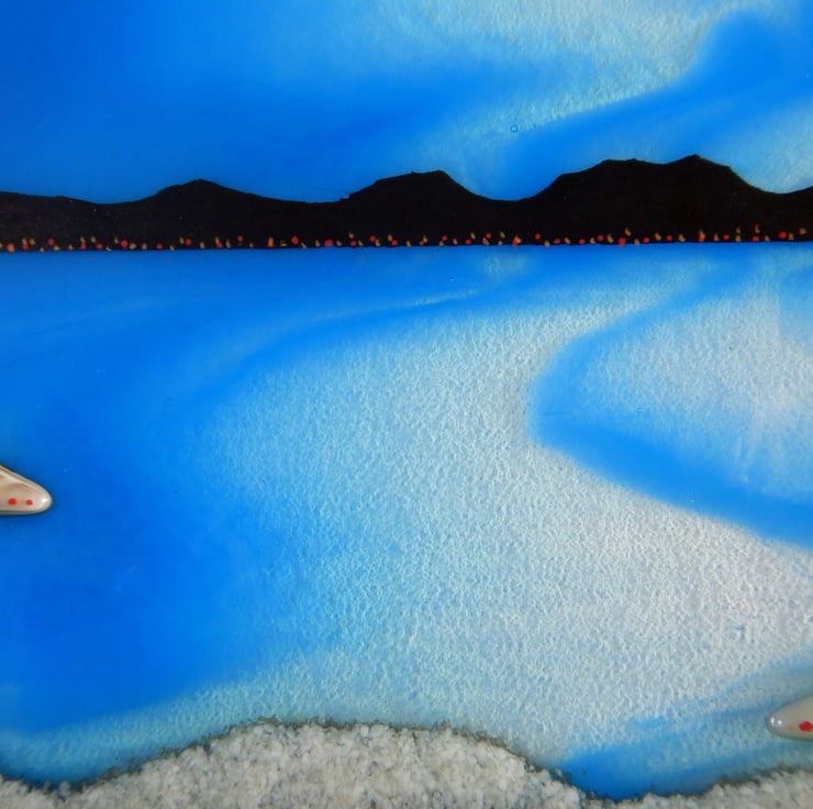 'ISLE OF JURA' is a subtle mix of Scottish colours. The actual isle has been very carefully painted using finely ground powdered glass. The foreground is cut shapes of streaky brown and caramel sheet glass. A tiny bit of bling has been added by scattering little sections of dichroic glass. Once the picture was completed it was then fused in my kiln at 1400 where all sections became one!