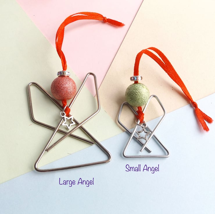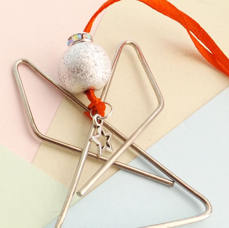 This "Christmas Angels" hanging decoration is an easy piece to make. No tools required. Simply atach the ribbon to the wire frame, then string the beads onto the ribbon and secure with a knot. Finish it off by attaching the silver star charm.