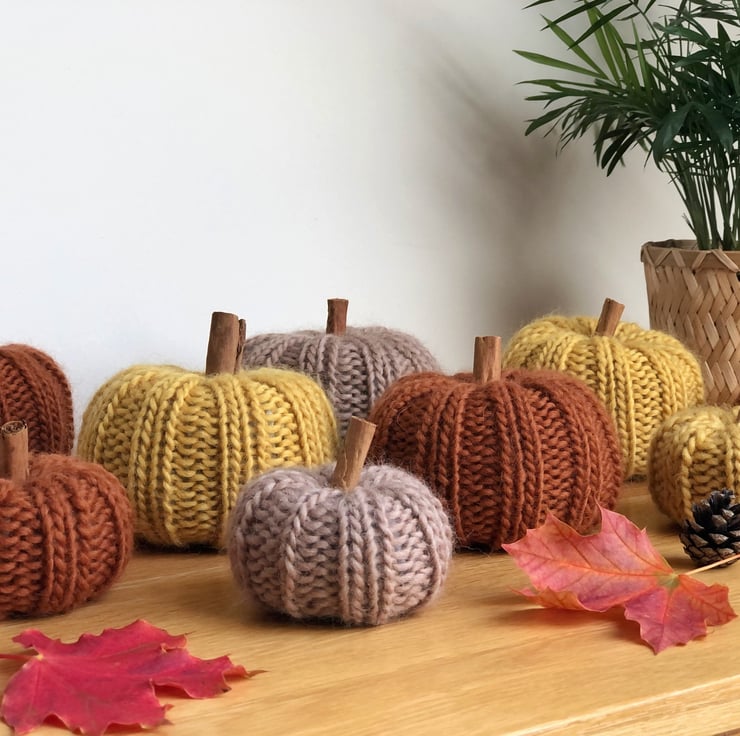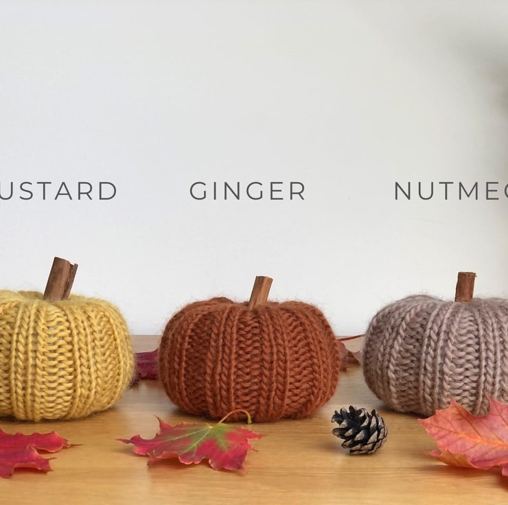 I absolutely love this time of year with the changing colours of the trees and cooler evenings giving us the excuse to get snuggled up at home. We love growing big whopping pumkins on our allotment but I really wanted to make a soft touchy feely pumkin to celebrate the season at home. Making these hand knitted pumpkins has been bliss as the wool is beautifully soft and I love the warm autumnal colours. Even better it is made in our neighbouring country of Yorkshire! I hope you agree, these are a lovely way to create that cosy autumn feeling at home.