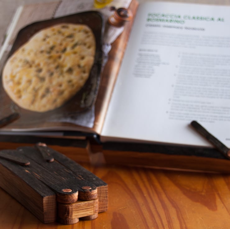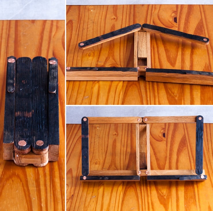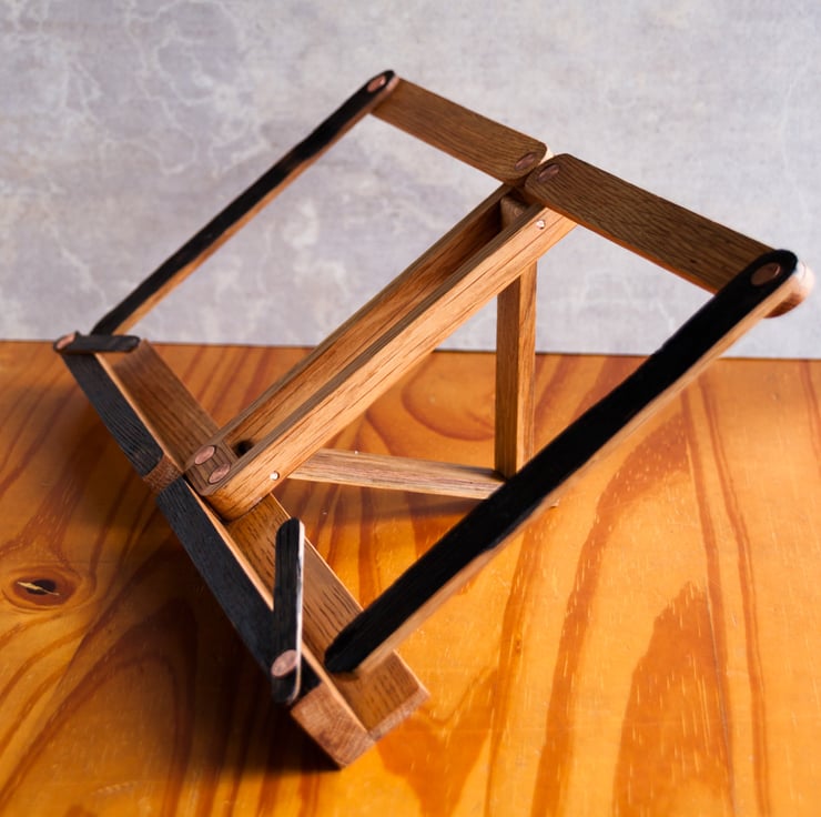 A folding recipe book stand or table top music stand made from whisky barrel staves.