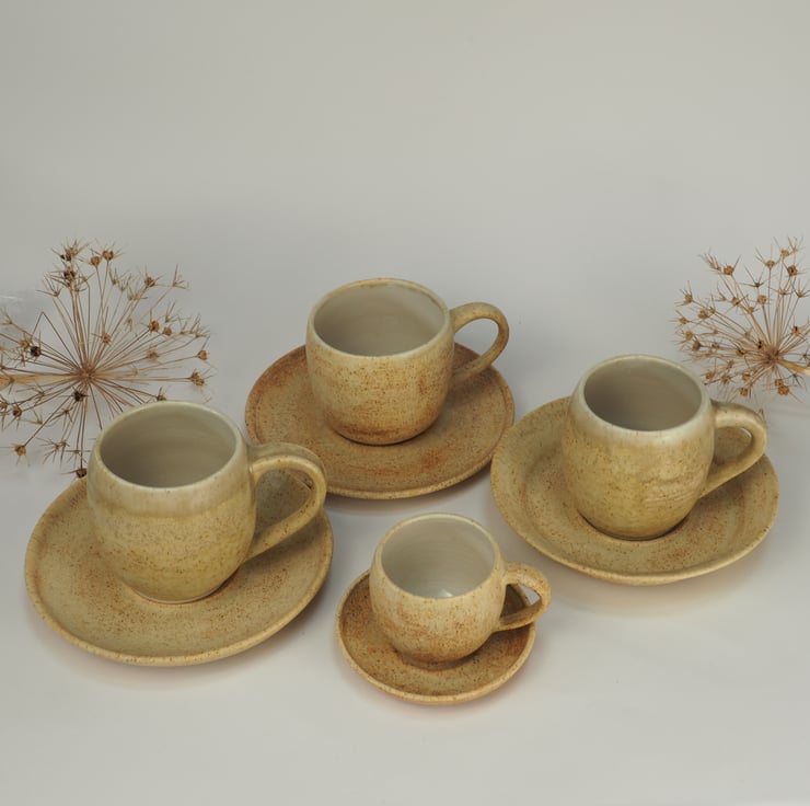 Both are finished in a toasty speckled oatmeal glaze, with transparent gloss inside the cup.