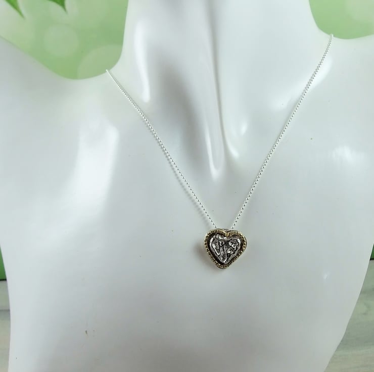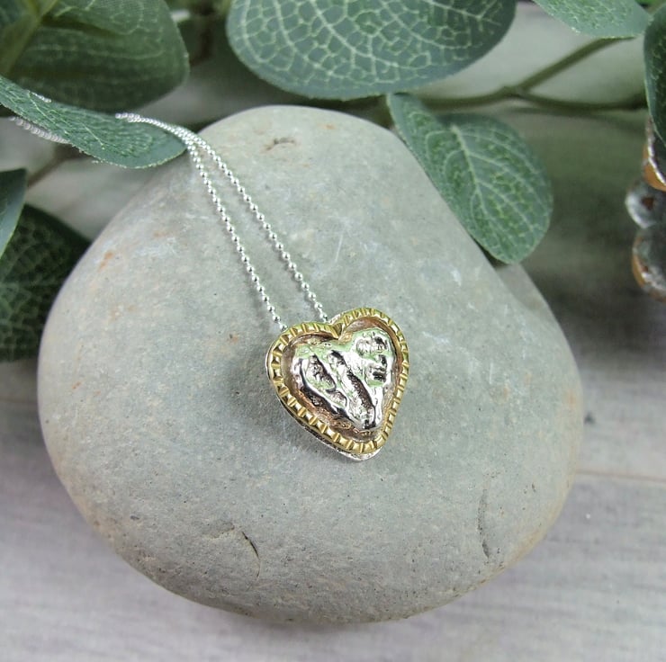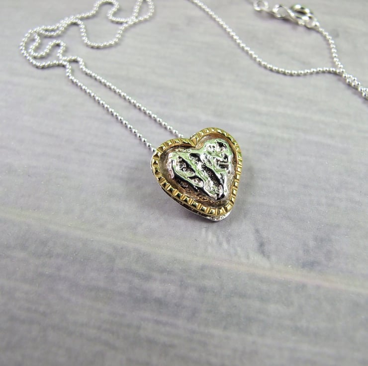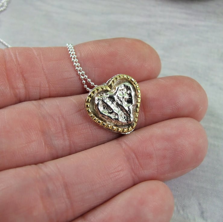 Small Silver Heart pendant, dainty hand cast recycled silver heart necklace with decorative brass edges..