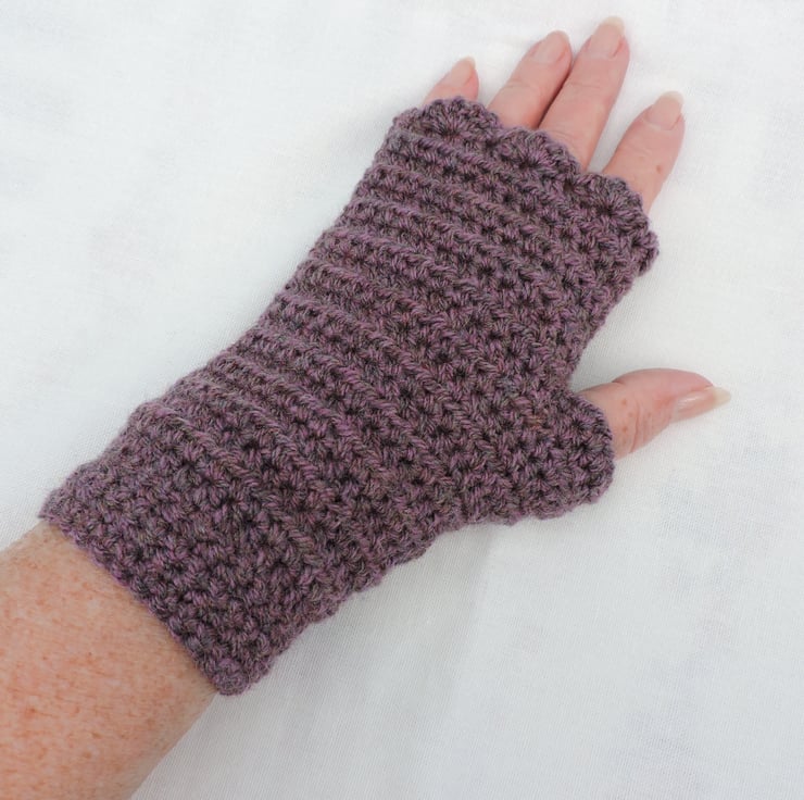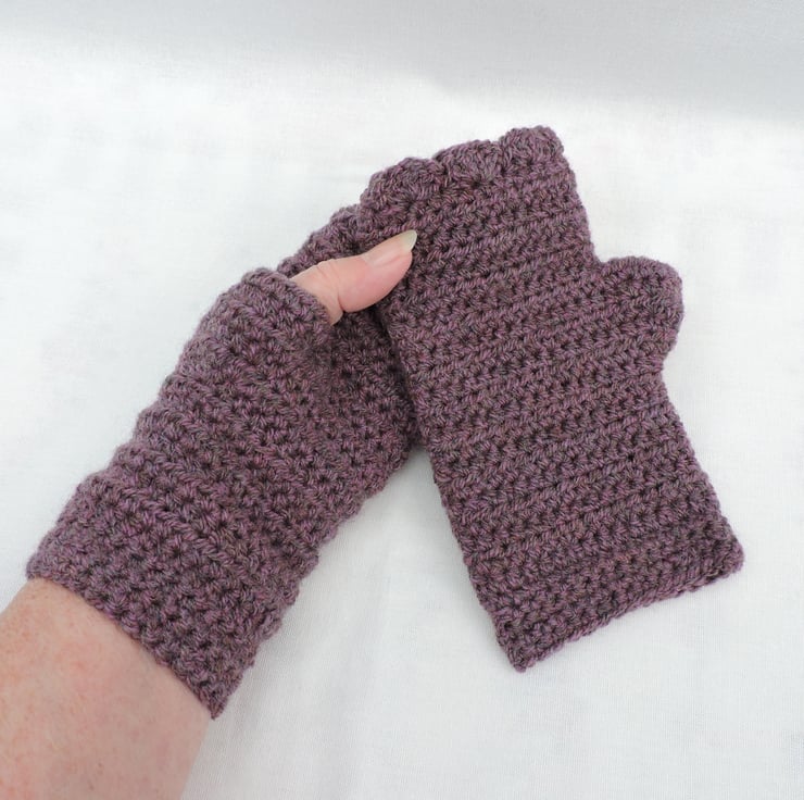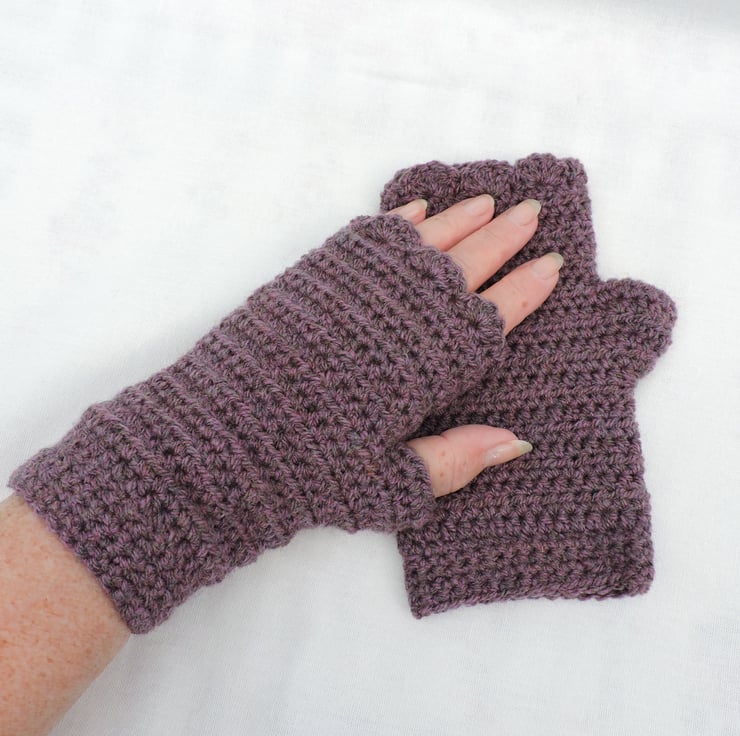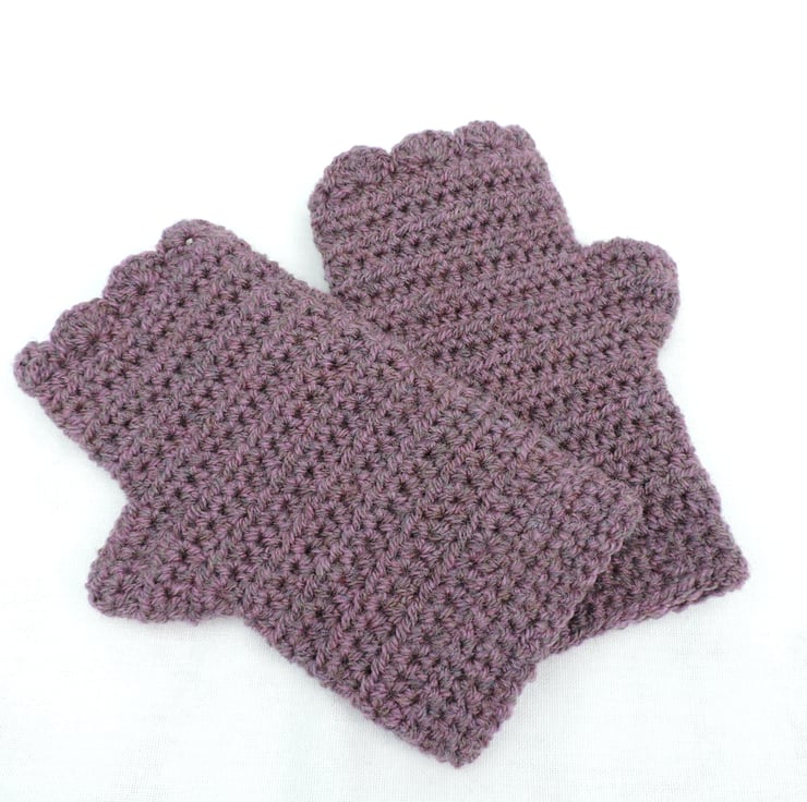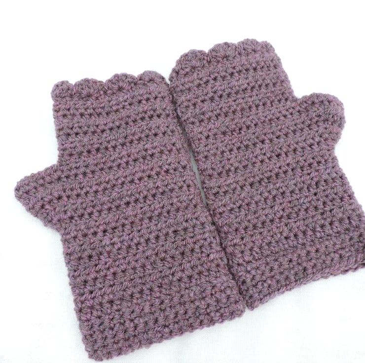 An end of line Seconds Sunday item. Crocheted adults fingerless mitts which have been made using a double knit 100% acrylic yarn. A lovely deep grape colour. They have a plain body and are finished with a wavy edged top. A soft and cosy winter warmer, ideal for dog walkers and those who need to have their fingers free.