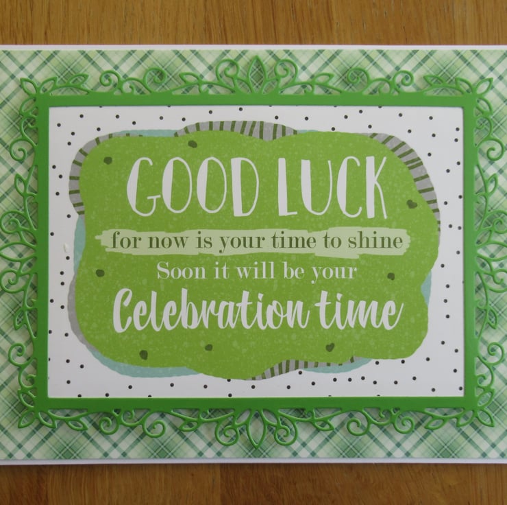 This is a lovely bright and cheerful card, ideal for someone you wish to send good luck to. I have die cut a decorative frame from green card to surround the image and these have been raised with 3D foam. The insides coordinates but has been left blank for your own message.