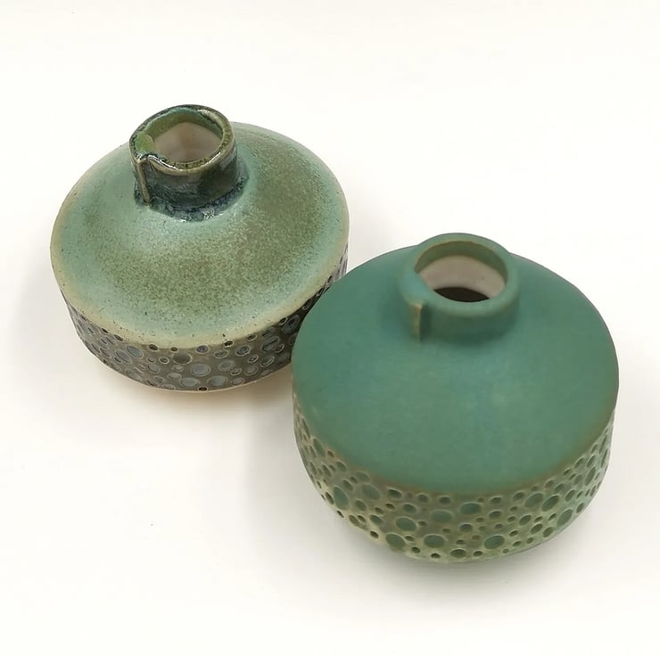 Small bud vase. Slab built in stoneware clay with hand impressed design and turquoise green glaze.