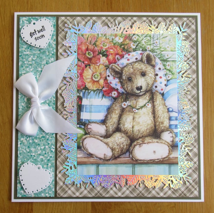 This lovely get well soon card features the image of a very old teddy bear wearing a spotted hat. I placed a silver, decorative die cut frame behind the image and embellished the card with a white satin bow. 2 die cut hearts have been added, one with the message 'get well soon'.