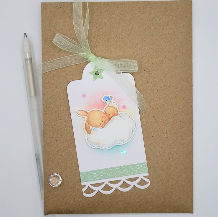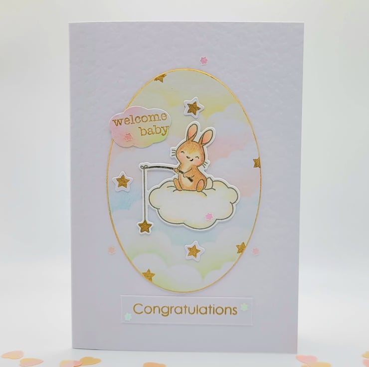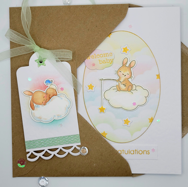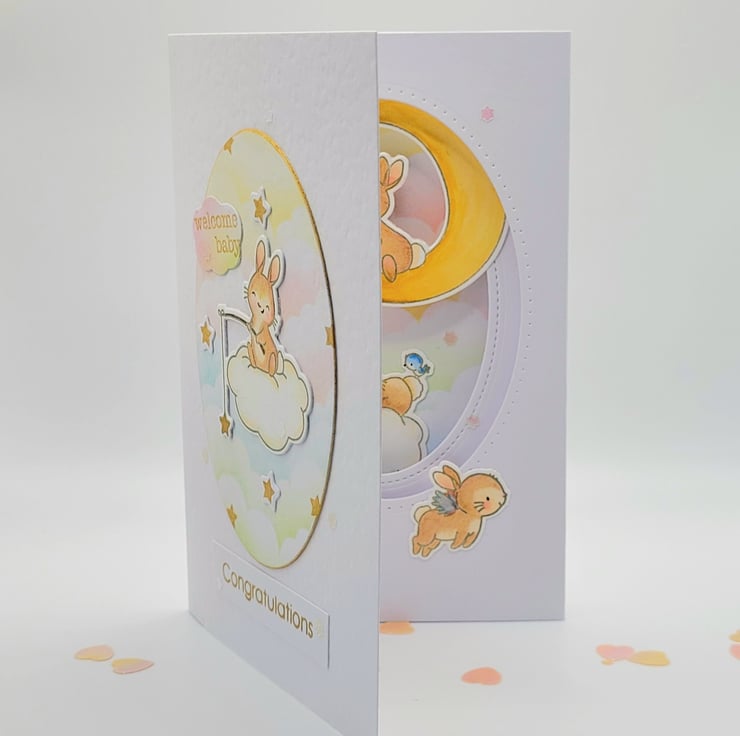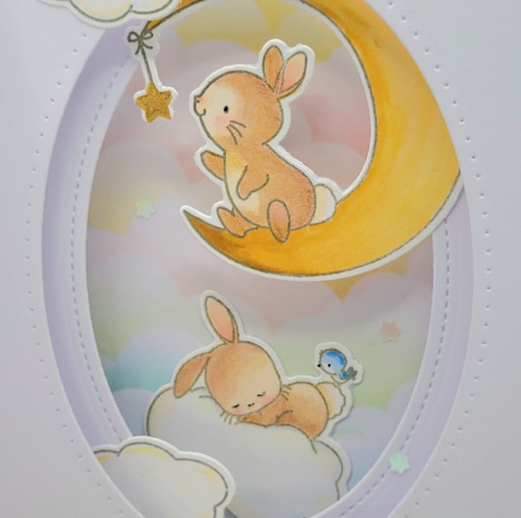 I made the outer card base from heavyweight hammered white card. The inside box/tunnel effect is made from quality white recycled card and die cut oval apertures. The outside of the card is decorated with an oval panel which I ink blended clouds onto and added a baby bunny catching some stars. There is a small sentiment which is stamped in gold and reads CONGRATULATIONS. Lots of lovely dimension and details are features of this cute new baby card, with matching optional gift tag.