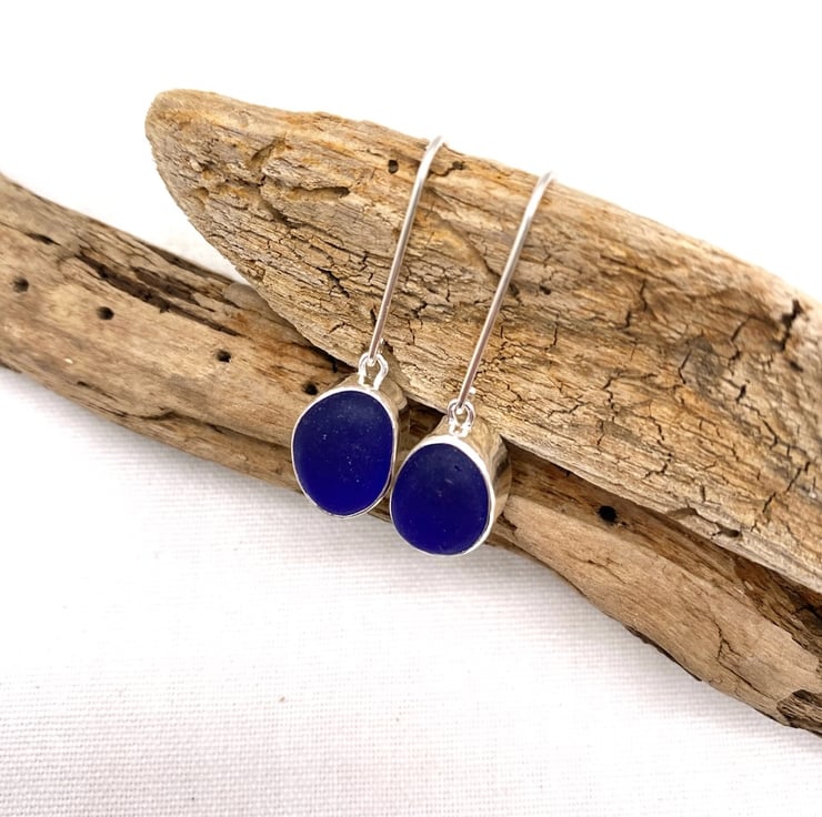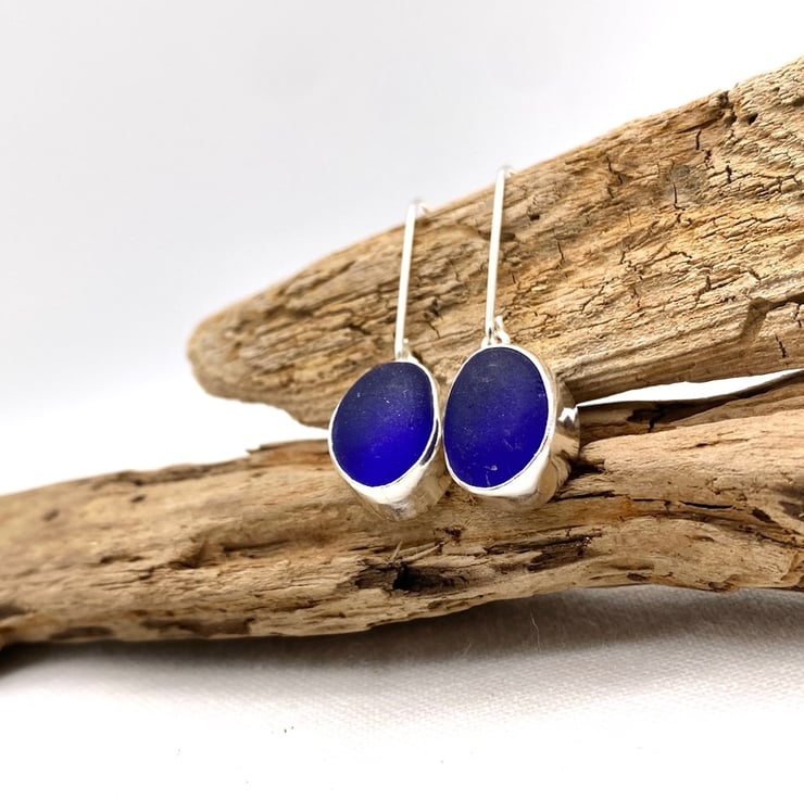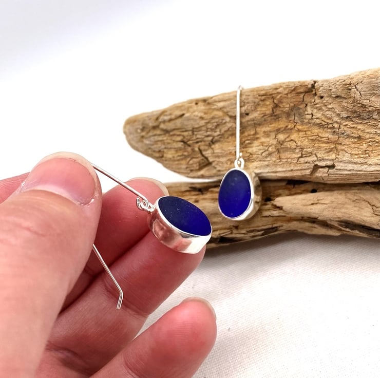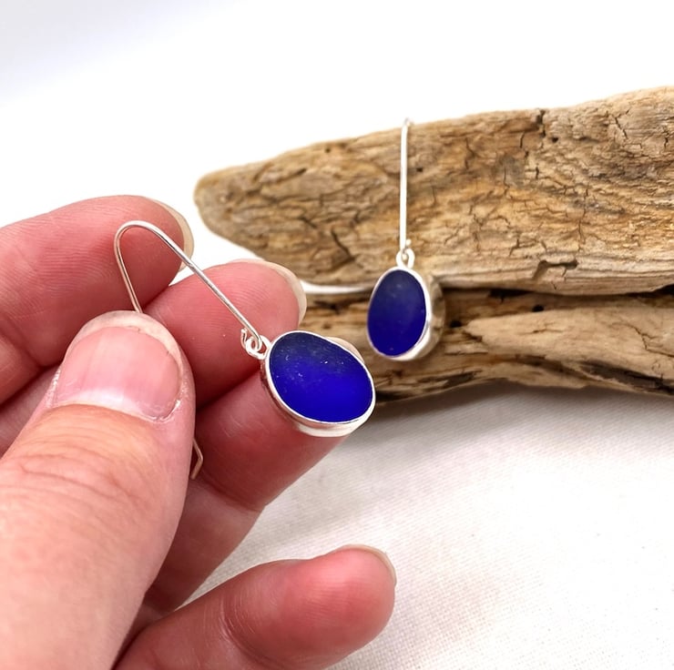 The pieces of sea glass have been set in a handmade sterling silver setting and hung on handmade sterling silver earring hooks.