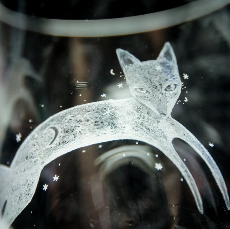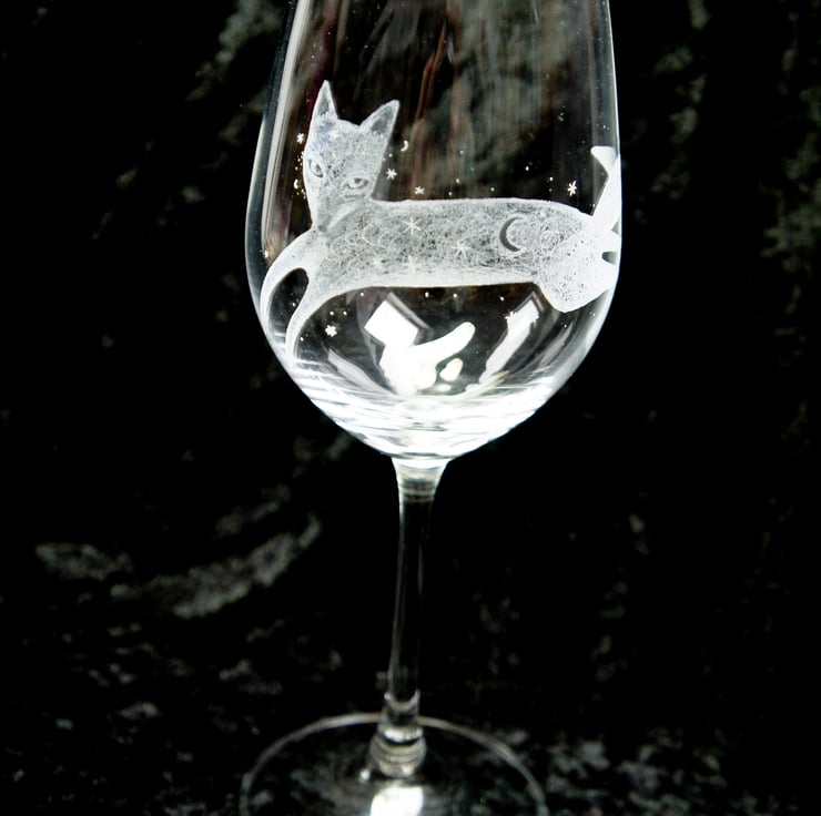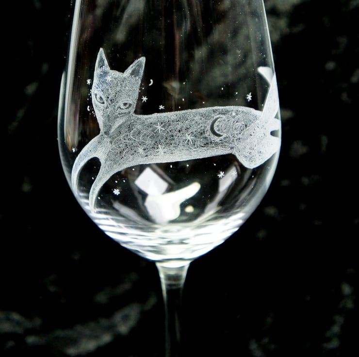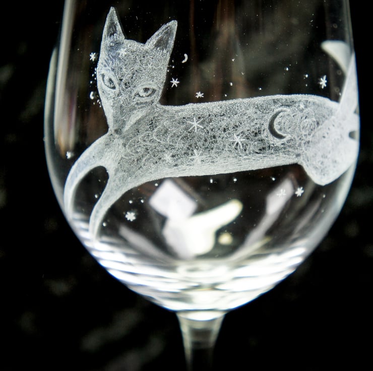 A hand engraved crystal wine glass. The engraving depicts a fox, the engraving is called 'When fox stole The Moon'. Hand engraved with a selection of stone, diamond tipped and rubber burs. This is the exact glass you will receive. Heavyweight Dartington crystal glass.
