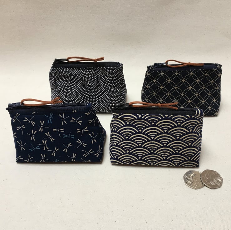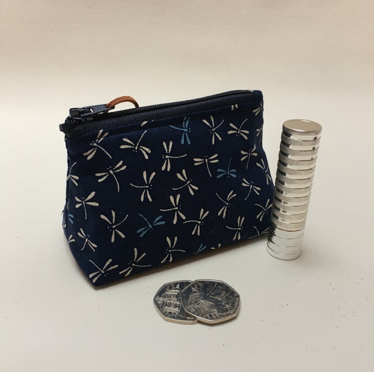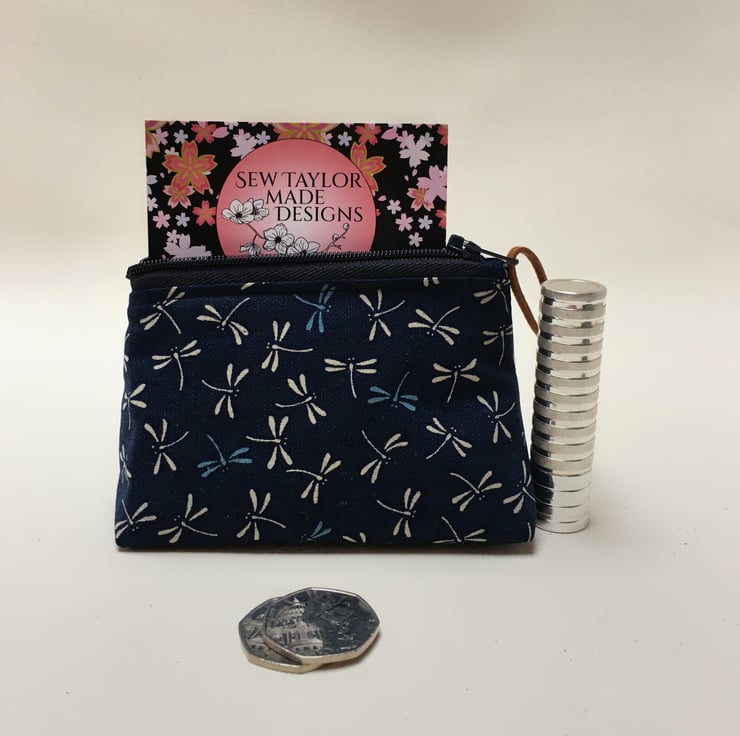 This coin purse has been created from dark blue cotton fabric that is made in Japan with blue and cream dragonflies. It has been lined with a Liberty of London fabric that compliments the dragonfly fabric.