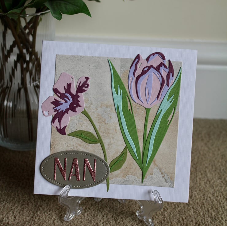 This is a pretty handmade Nan Birthday Card, made with die cut flowers, set on a marble effect background.