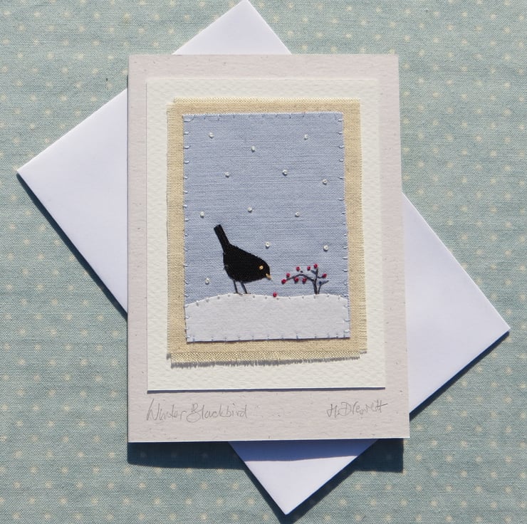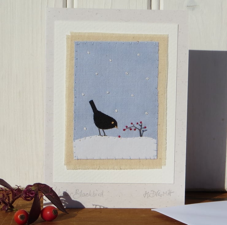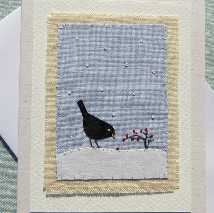 A miniature hand-stitched applique blackbird in snow with intricate top-stitched details including a bush of berries. Background blue cotton is recycled and hand-dyed. Perfect for any winter celebration, Christmas, or a thank you card to keep!