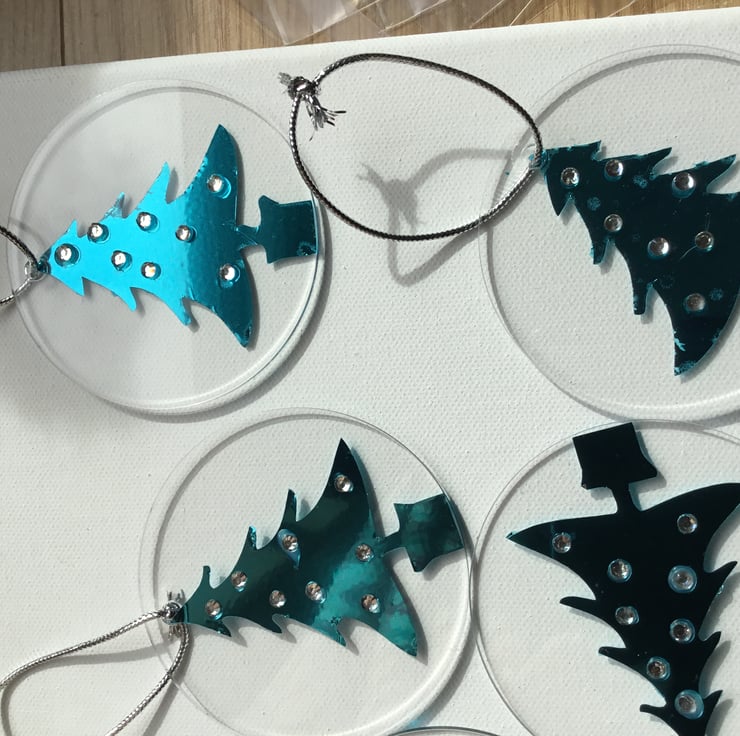 A sparkly teal Christmas tree adorned with beads as baubles on a clear acrylic bauble.