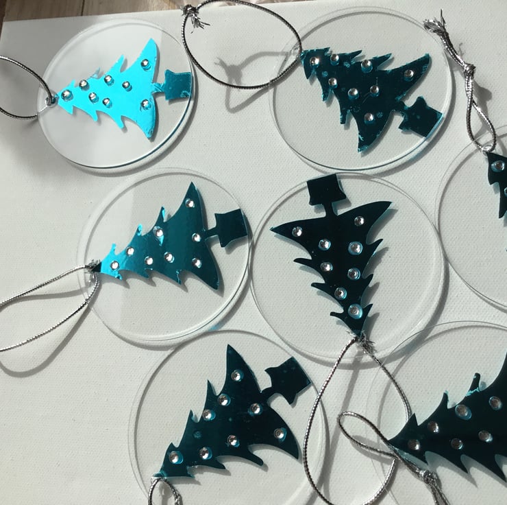 A sparkly teal Christmas tree adorned with beads as baubles on a clear acrylic bauble.