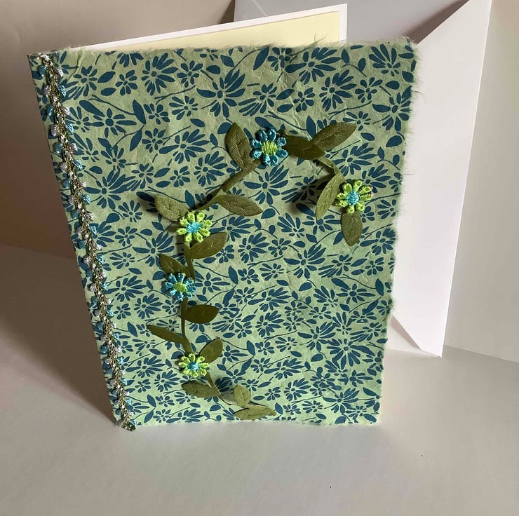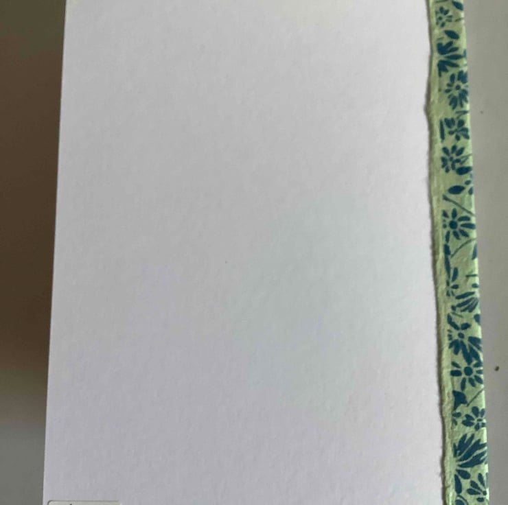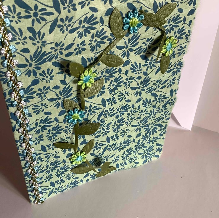This card has pale green and teal flower pattern. It has been torn at the edges for a softer look.