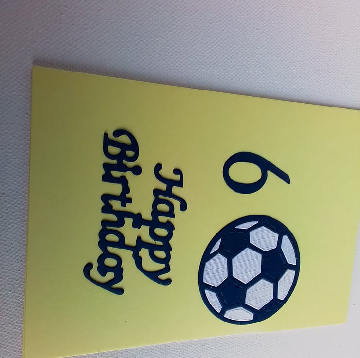 The pale yellow card has a blue 6 and a blue and white football as the 0.