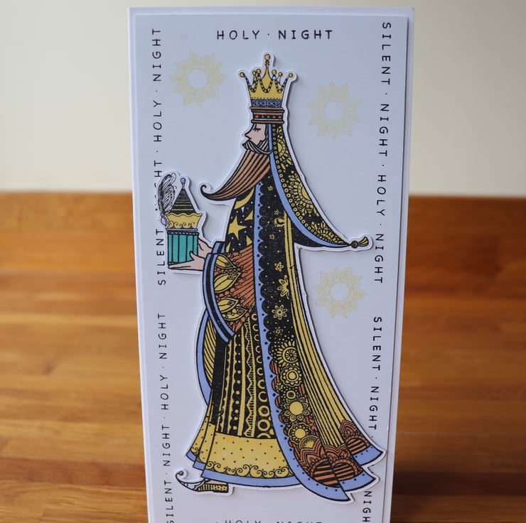 Has one Matt and layer, I have designed this card with silent night holy night around the edges of the card I then coloured in the king with pro alcohol pens.