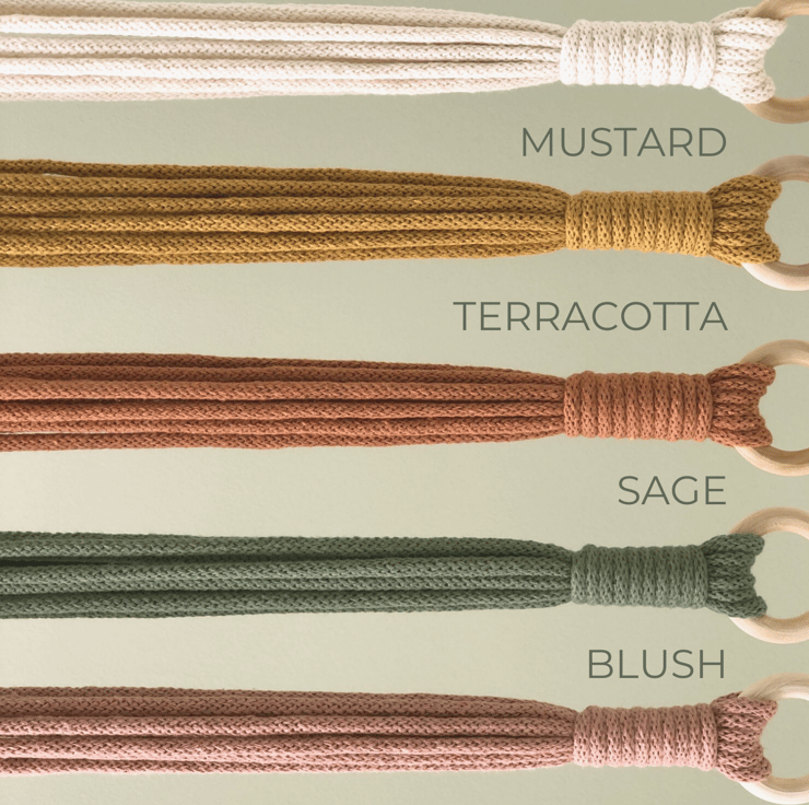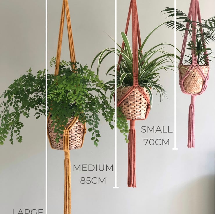 Measurements are approximate and taken from the top of the wooden ring to the bottom of the tassel. These will shorten slightly when your plant pot is added.