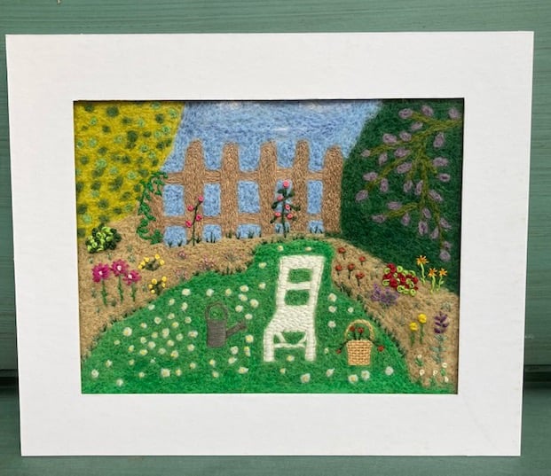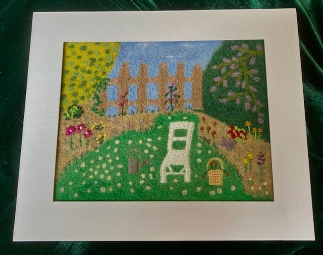 This delightful picture of a corner of a cottage garden with its flower beds, picket fence & daisy covered lawn has been needle felted onto linen. The basket of picked flowers, white chair & watering can have been hand embroidered as well as some of the flowers to create a 3 dimensional feel to the garden. The picture measures 14cm x 18 cm & has been framed with white mounting board to create a finished piece measuring 20cm x 24 cm. The picture has been backed with natural linen. This little piece of art could be hung as it is or you could frame it in a frame of your own choice.