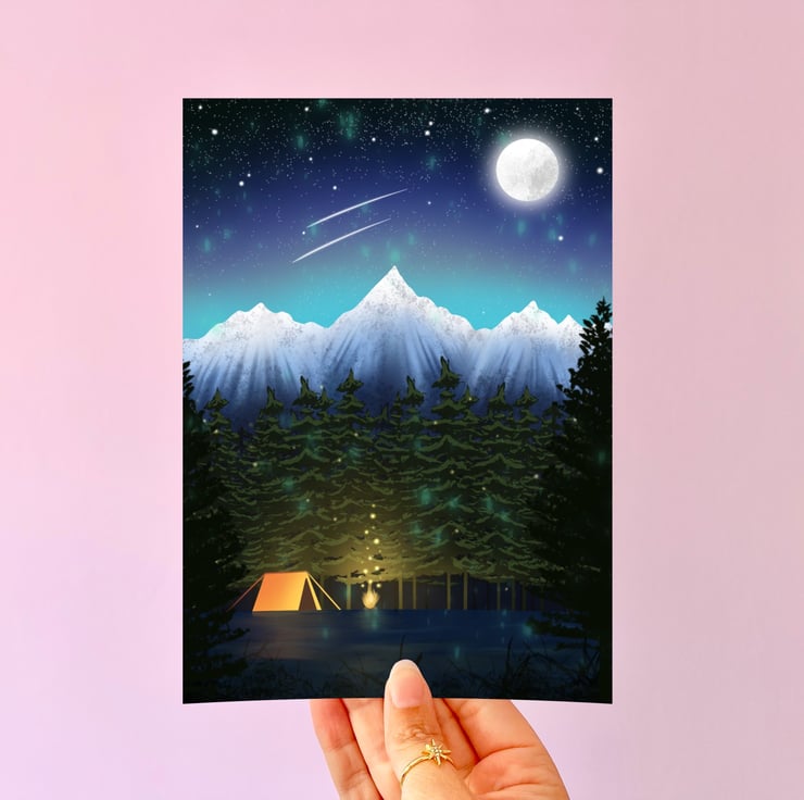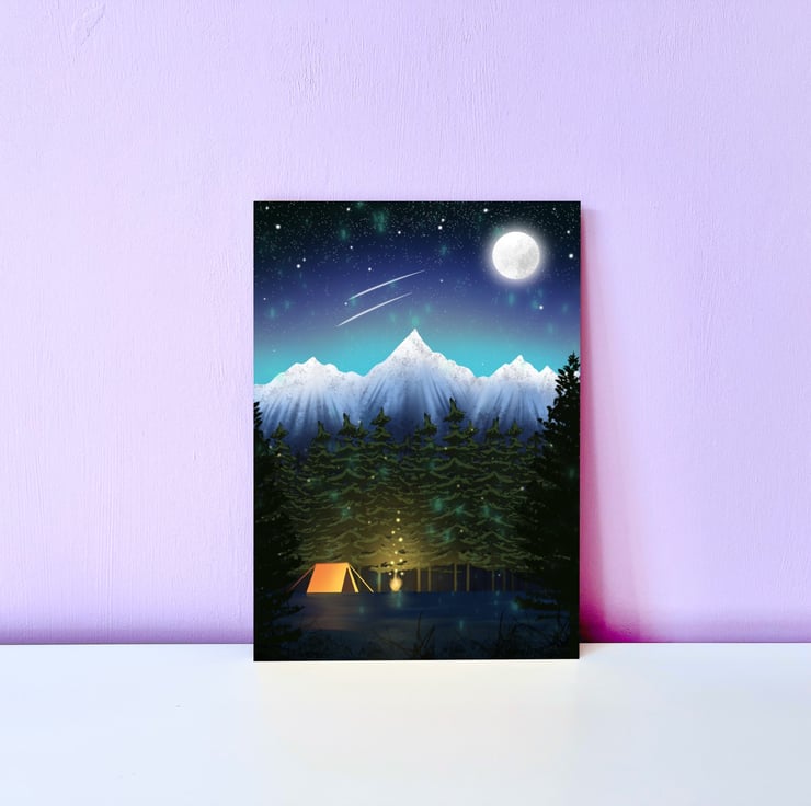 This magical cosy camping scene print is a digital drawing that has been hand drawn on my iPad using Procreate. A lovely print for anyone who loves camping, hiking or going on adventures. Printed on 290gsm smooth pearl art paper and using high quality archival inks these prints can last a life time without fading.
