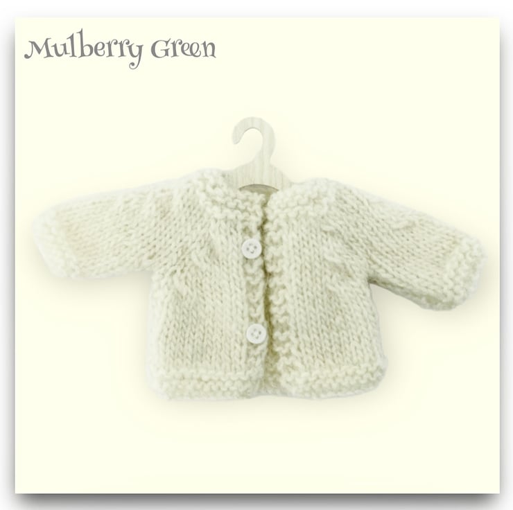 A plain Winter white cardigan, hand knitted in pure Icelandic wool, to fit the Mulberry Green dolls.