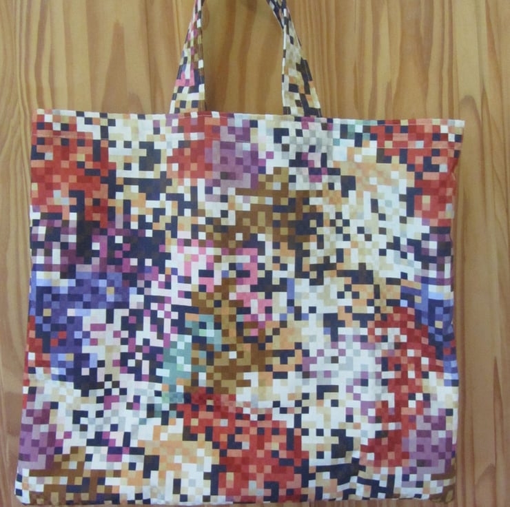 Tote bag in a geometric fabric. Purples, pinks, blues, creams, reds.