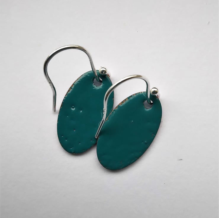 A pair of beautiful oval copper earrings in delicate blue, green and white. The earrings have been kiln-fired and each measures 20mm long and 12mm at the widest point, and come complete with sterling silver earring wires. The backs have been finished in glossy turquoise enamel. They are supplied with a little organza pouch and POSTAGE IS FREE!